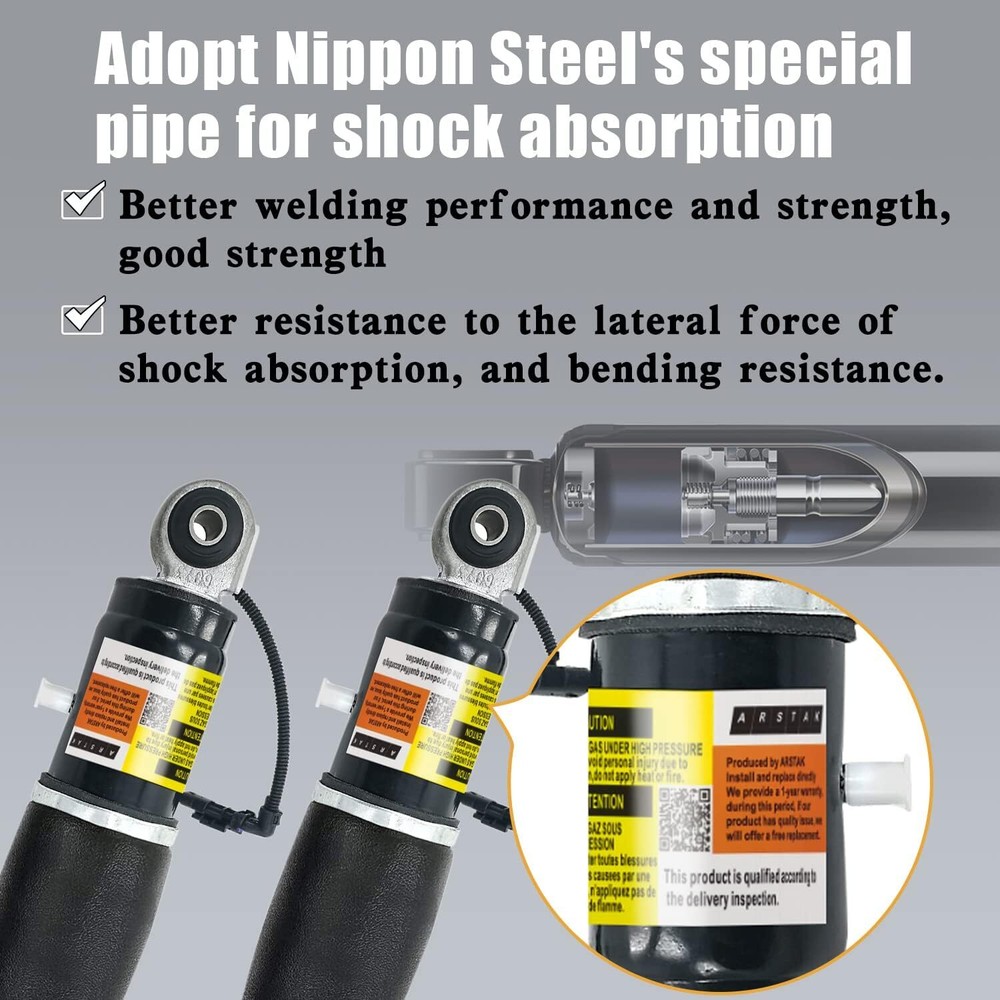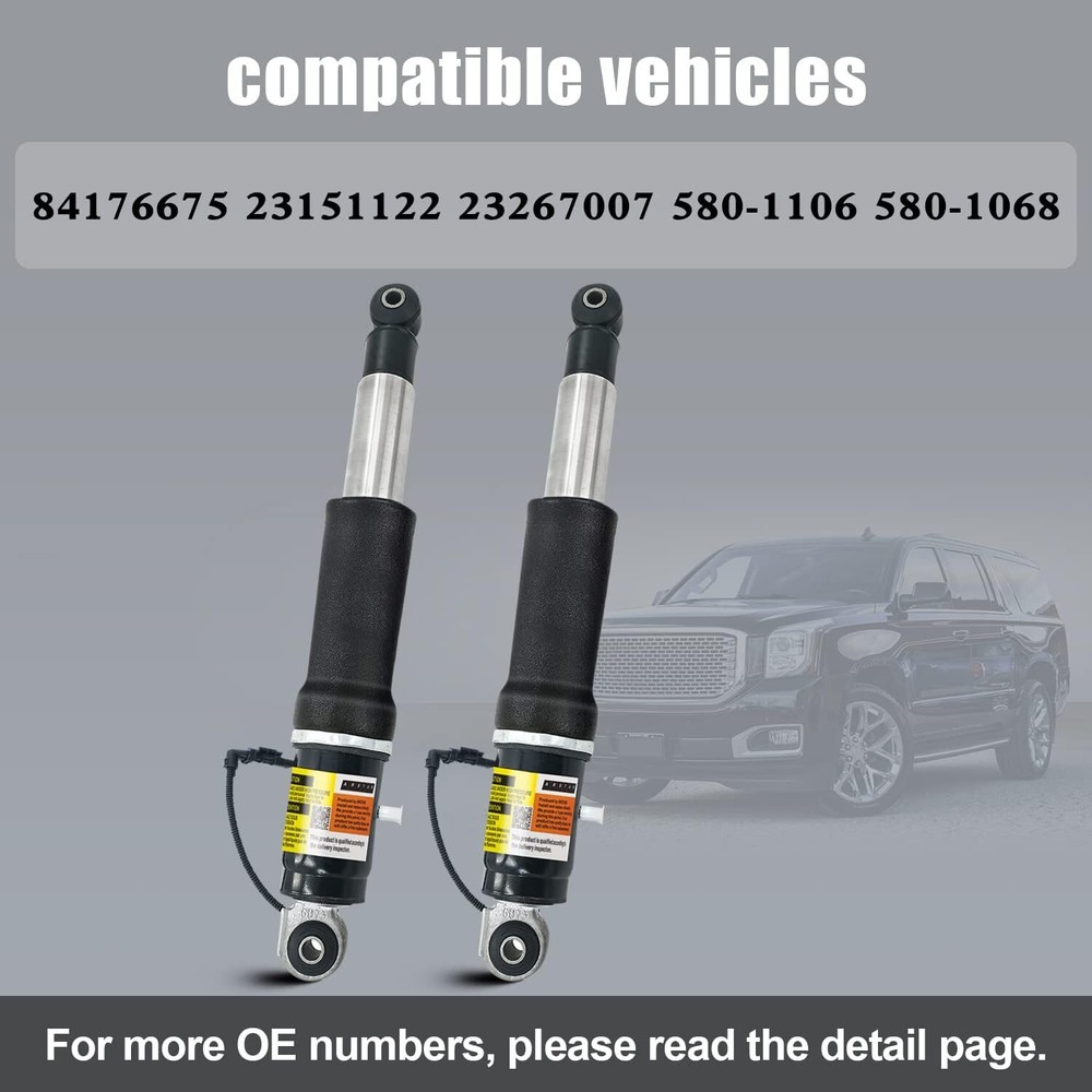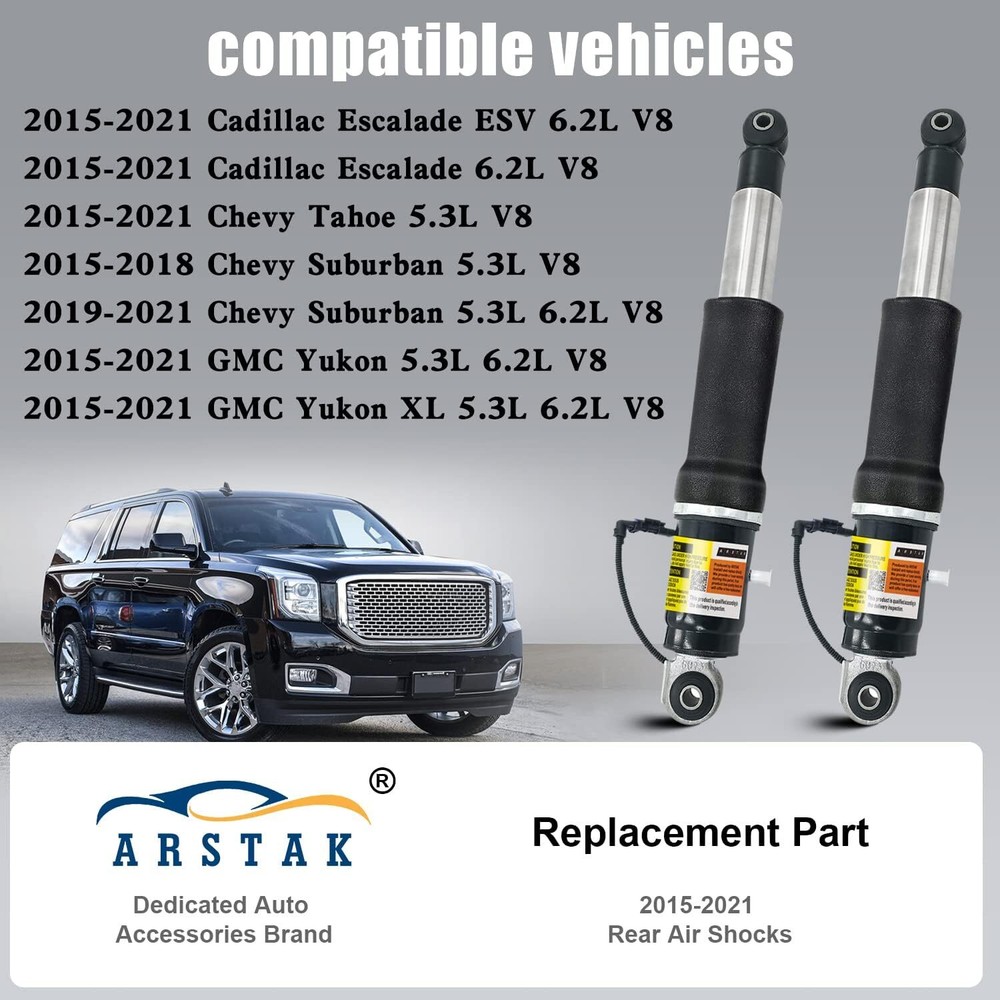 84176675 Rear Air Shock Strut Absorber Compatible with 2015-2020 Chevy Tahoe Suburban for Cadillac Escalade ESV for GMC Yukon XL 23151122 23267007 23290661 (2 Pack) Item Description About this item [Designed for Air Ride Component Standard]: Fits for Cadillac Escalade 2015-2020, for Cadillac Escalade ESV 2015-2020, Chevy Suburban 2015-2020, for Tahoe 2015-2020, for GMC Yukon 2015-2020, for Yukon XL 2015-2020 [Replacement Part Number]: 84176675, 580-1106, 580-1068, 23151122, 23267007, 23290661, 23290660 [84176675 OE Rear Shock Struts]: If you are not sure whether is compatible with your vehicle, please feel free contact and send us your VIN number to us for confirmation [Smooth Ride Again | Direct Replacement]: The rear shock is f-actory test verification. The connector for the air line is as good as the OE shock fitting. Gives you a smooth ride again [High-Standard Oil-Seal Technology]: 1 Years W-arranty. 7/24 response service. At ARSTAK, zero risk purchase is for every customer's smiles. If your product has any quality problems, please contact us and we will replace you with new accessories › See more product details *No need to distinguish between left and right, use in pairs. *Dedicated customer one on one service with quick feedback. *Pls tell us your VIN number. We can help you query as soon as possible. 2015-2020 Fit for Cadillac Escalade (Base, Luxury, Platinum, Premium 6.2L V8 - Flex, 6.2L V8 - Gas) 2015-2020 Fit for Cadillac Escalade ESV (Base, Luxury, Platinum, Premium 6.2L V8 - Flex, 6.2L V8 - Gas) 2015 Fit for Chevy Suburban (LS, LT, LTZ 5.3L V8 - Flex) 2016-2018 Fit for Chevy Suburban (LS, LT, LTZ Premier 5.3L V8 - Flex, 5.3L V8 - Gas) 2019-2020 Fit for Chevy Suburban (LS, LT, Premier 5.3L V8 - Flex, 5.3L V8 - Gas, 6.2L V8 - Flex, 6.2L V8 - Gas) 2015-2017 Fit for Chevy Tahoe (LS, LT, LTZ, PPV, SSV 5.3L V8 - Flex, 5.3L V8 - Gas) 2018-2020 Fit for Chevy Tahoe (Premier 5.3L V8 - Flex, 5.3L V8 - Gas, 6.2L V8 - Flex, 6.2L V8 - Gas) 2015 Fit for GMC Yukon/XL(Denali, SLE, SLT 5.3L V8 - Flex, 6.2L V8 - Flex, 6.2L V8 - Gas) 2016-2020 Fit for GMC Yukon/XL(Denali, SLE, SLT 5.3L V8 - Flex, 5.3L V8 - Gas, 6.2L V8 - Flex, 6.2L V8 - Gas) Payment We accept payment only through PAYPAL Shipping We ship products worldwide through standard express courier service, it will reach within 7 to 10 days to abroad buyers, we ship the product after recieved clear payment and give full information about shipment to the buyer Return We accept product return within 7 to 21 days from delivery date but product should be in original position and not in damaged condition,the return shipping charges will be buyer responsibility