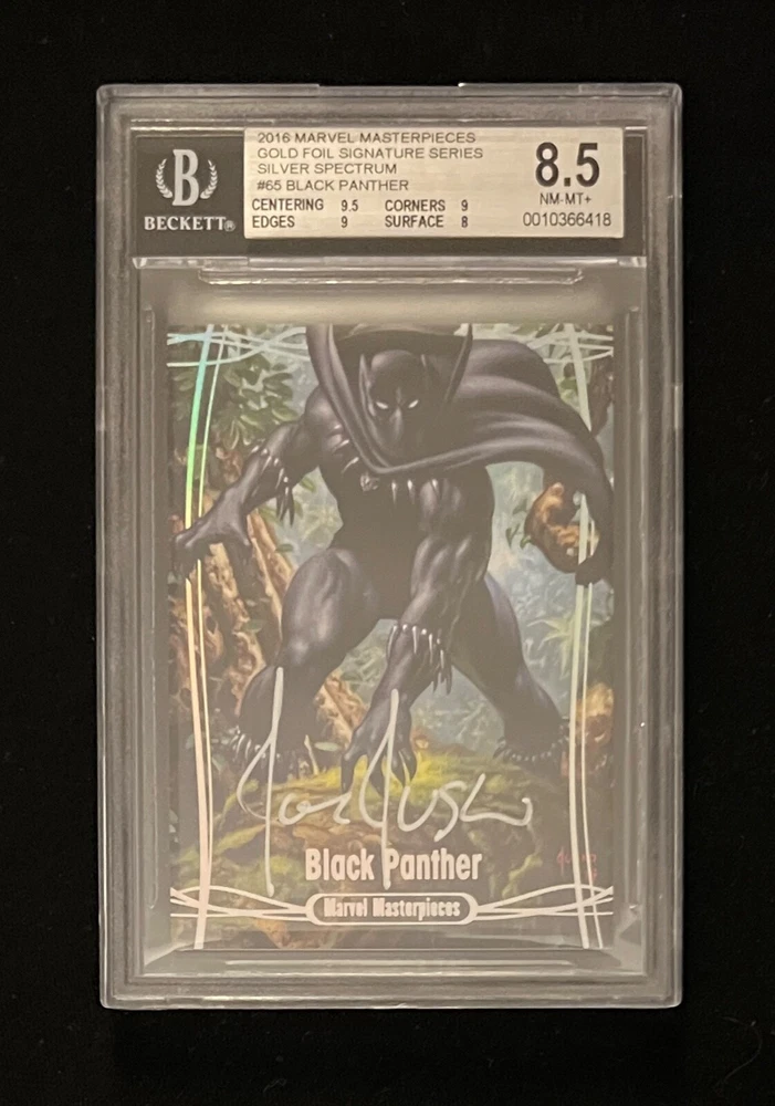 2016 MARVEL MASTERPIECES # 65 BLACK PANTHER SILVER SPECTRUM AUTOGRAPH CARD. CASE HIT /10 CARD IS GRADED BY BECKETT GRADING SERVICES AT NM/M+ CONDITION 8.5. 06/10 CARD IS SIGNED BY ARTIST JOE JUSKO AND CERTIFIED BY THE UPPER DECK COMPANY. RAINBOW REFRACTOR CARD AND SLAB ARE IN GREAT CONDITION. ALL MY ITEMS COME FROM A SMOKE-FREE HOUSE. SHIPMENT WILL BE SENT IN 2 DAYS OF PAYMENT. I WILL SHIP THIS CARD IN THE GREATEST OF CARE. BUYERS OUTSIDE OF THE CONTINENTAL U.S. MAY HAVE TO PAY EXTRA FOR SHIPPING. I DO OFFER COMBINE SHIPPING RATES. SO PLEASE CHECK OUT MY other items . FEEL FREE TO MESSAGE ME WITH ANY QUESTIONS. THANKS FOR LOOKING AND GOOD LUCK.