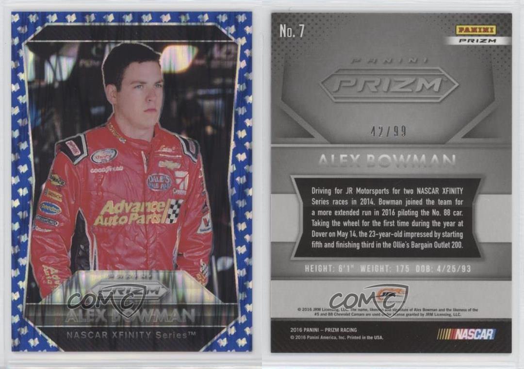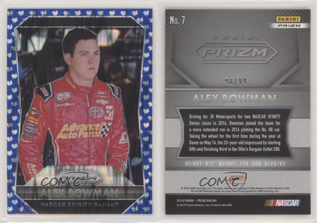 2016 Panini Prizm NASCAR - [Base] - Blue Flag Prizm #7 Alex Bowman Qty Made: 99 - Racing Card - Featuring the Tommy Baldwin Racing - Featuring Alex Bowman Search for more: 2016 Panini Prizm NASCAR Search for more: 2016 Panini Prizm NASCAR - [Base] - Blue Flag Prizm View all of our Listings Auctions Buy It Now About Us Located in the beautiful Pacific Northwest, COMC (Check Out My Cards) is the world's largest consignment service for trading card singles. More than 10,000 people have used our consignment service to list over 50 million trading cards. We currently house 20 million cards, each listed for sale with front and back images of the actual card. Find out how we can help you consign your items on eBay by contacting us through eBay messaging. COMC -- "The Safe & Easy Way to Buy & Sell" Representative Image - Select Specific Item above to see image of actual item Representative Image - Select Specific Item above to see image of actual item Raw Condition for Modern Cards Unless otherwise noted, raw modern cards are listed in Near Mint-Mint condition or better. A NM-MT card appears to be Mint at first glance, but upon closer inspection, may exhibit some of the following: minor print defects (e.g. roller marks, print line, dimple), minor scratches, slight edge wear, and slight corner wear. Centering is clearly visible in the images provided and does not factor into our condition assessment. Raw Condition for Vintage Cards Unless otherwise noted, raw vintage cards are listed in Excellent condition or better. An EX card may exhibit some of the following: minor rounding of corners, surface wear, print defects, light scratches, and slight edge wear/chipping. Centering is clearly visible in the images provided and does not factor into our condition assessment. Domestic Shipping Combined shipping for multiple items is available. To receive combined shipping, please ensure all desired items are in your eBay shopping cart before proceeding to checkout. eBay limits orders to 40 items per order. We automatically combine multiple orders placed on the same day. If you place multiple orders on the same day, please contact us to request a refund of applicable shipping costs. Signature confirmation may be required on invoices over $400. Raw cards are shipped in toploaders. International Shipping COMC offers eBay's International Shipping (EIS) for international orders under $2,500* (see country exceptions below). All duties and import fees are paid at checkout; in the rare event that there are additional import fees upon delivery, these are borne by the buyer. EIS packages route through a shipping hub in Erlanger, KY before shipping to their final destination. Please note that EIS does not allow for combined shipments. The shipping rates are determined by eBay and cannot be adjusted. *Maximum sale price exceptions: Colombia, Kuwait ($2,000); Taiwan ($1,539); Chile, Costa Rica, Guatemala, Honduras, Trinidad and Tobago ($1,000); Antigua and Barbuda, Aruba, Belize, Dominica, Grenada, Philippines, Saint Kitts and Nevis, Saint Lucia, Montserrat, Turks and Caicos Islands ($500); Dominican Republic, El Salvador ($200). Please request a shipping quote through eBay messaging for orders that exceed the maximum sale price supported by eBay's International Shipping. You will be responsible for all duties and import fees for international orders shipped outside the EIS. Raw cards are shipped in toploaders. Payment COMC does not accept offers on our cards through our eBay storefront. COMC utilizes eBay’s managed payments system. If you are experiencing difficulties making a payment, please contact eBay for assistance. Return Policy Returns are only accepted on the rare occasion the item is not as described. If you are making a return, please initiate the return process through eBay so a mailing label can be provided for you. Prior to listing, our expert team carefully assessed this item to represent it accurately. Please review the description and high-definition images prior to purchasing to ensure this item meets your satisfaction. We welcome you to contact us if you have further questions about this item. Trust and Integrity COMC carefully assesses each item consigned to us to prevent fraudulent items from entering the marketplace. If you believe an item offered on COMC may be fraudulent, please contact us with details so we can investigate the issue. Items we determine are outside our supported items policy may be removed. Last Modified: 10/14/2024 10:04:35 PM PDT