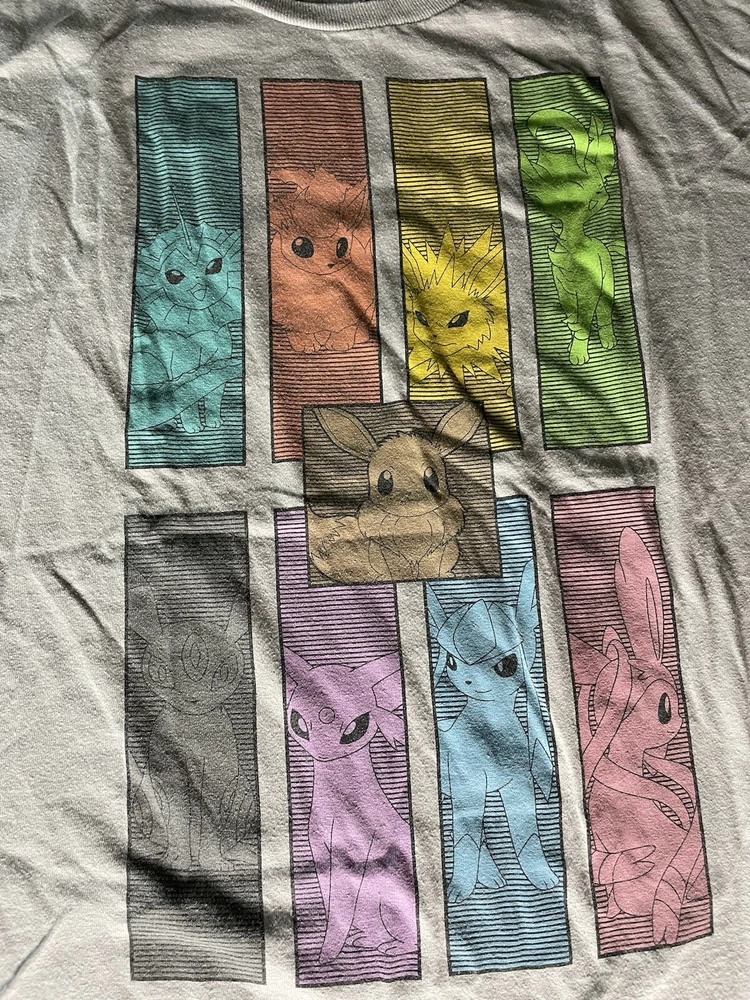 This 2016 We Love Fine Pokemon Eeveelutions 9 Panel Graphic T Shirt Men's Large L measures approximately 20” across chest and 28” long.