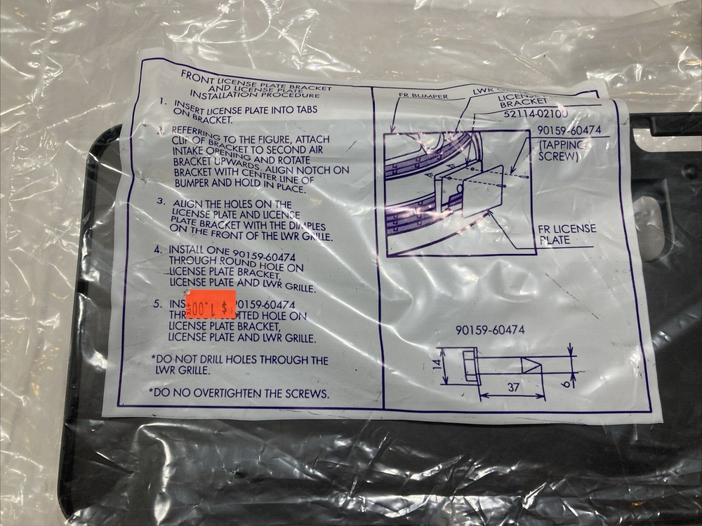 Finish:BlackInterchange Part Number:52114-02100Vintage Part:NoItems Included:ScrewsMaterial:PlasticType:Front License Plate BracketCountry/Region of Manufacture:UnknownOE Spec or Performance/Custom:OE SpecOE/OEM Part Number:52114-02100Fitment Type:Direct ReplacementPlacement on Vehicle:FrontManufacturer Part Number:52114-02100UPC:Does not applyManufacturer Warranty:No WarrantyUniversal Fitment:NoAttachment Type:Screw-Ongtin13:Does not applyColor:BlackPerformance Part:NoBrand:ToyotaFeatures:Easy Installation