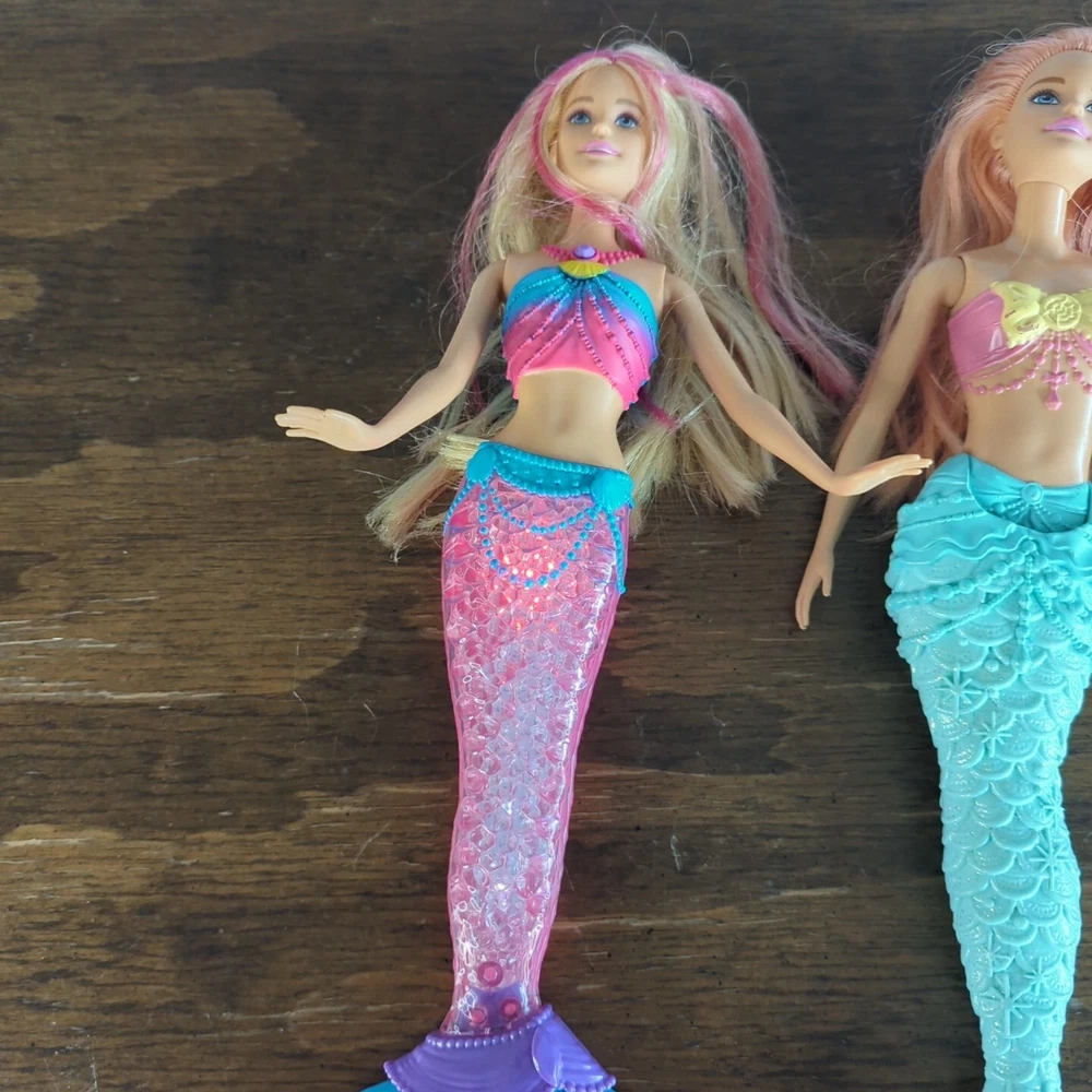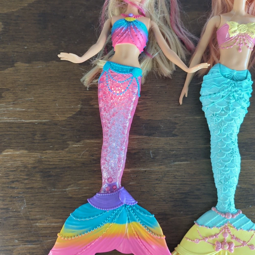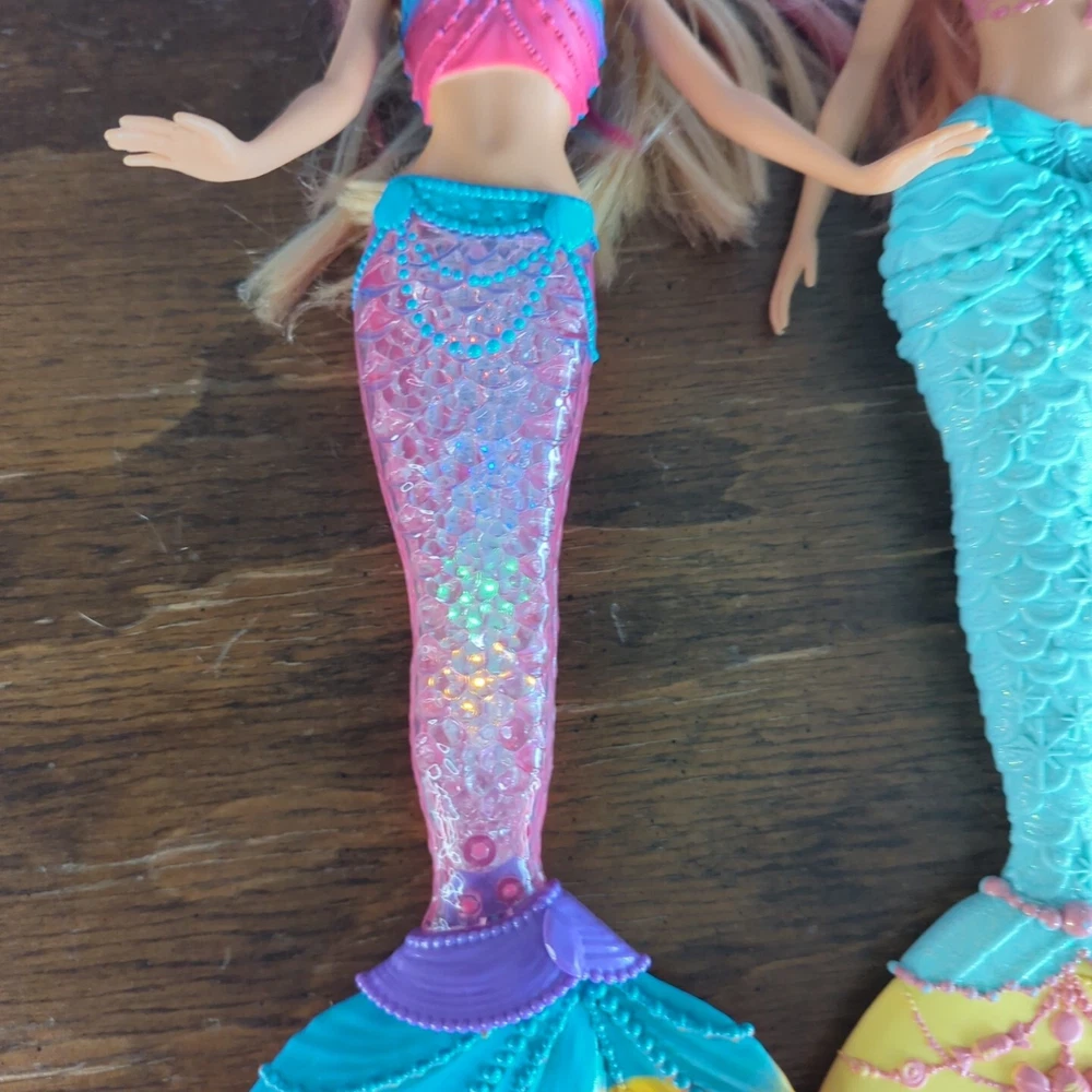 This is a lot of mermaid Barbie dolls. One has lights that do work. One has hair that needs some work. Has glue? Stuck in it