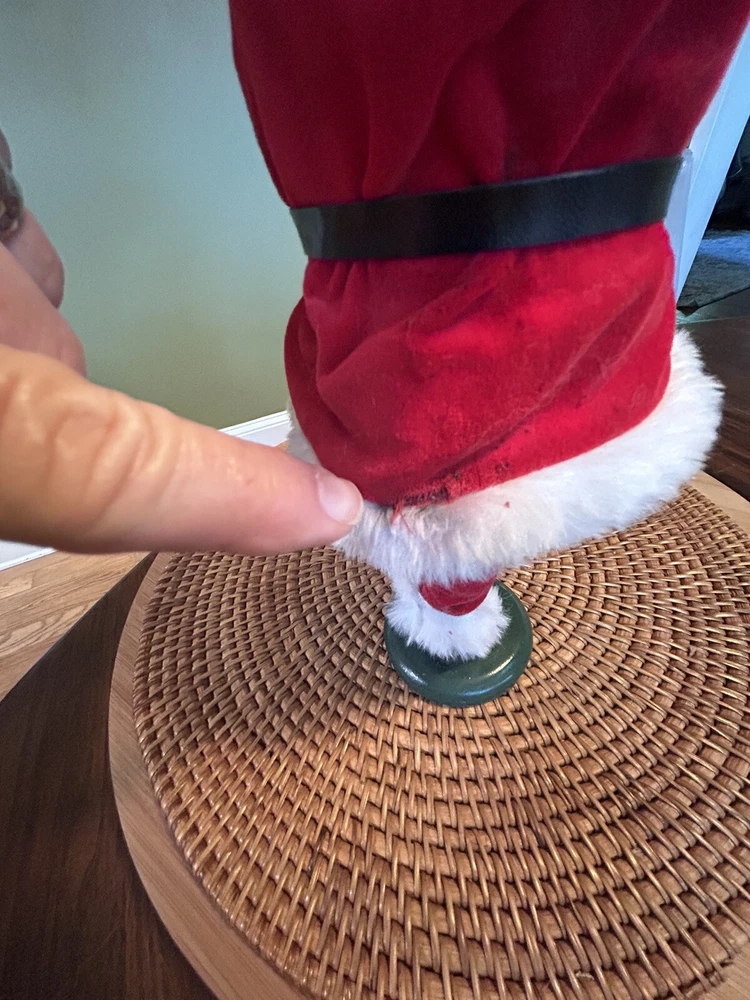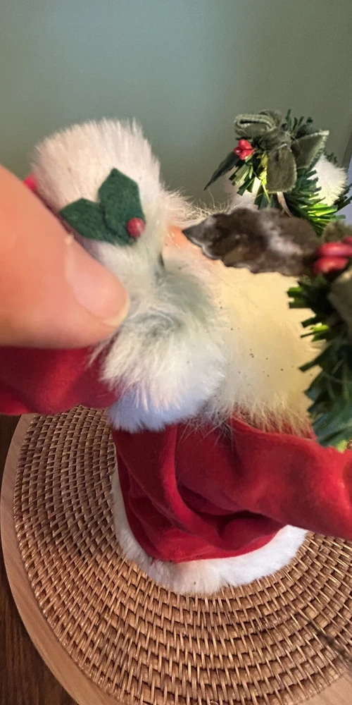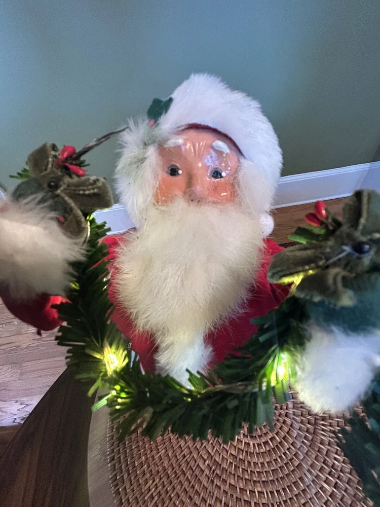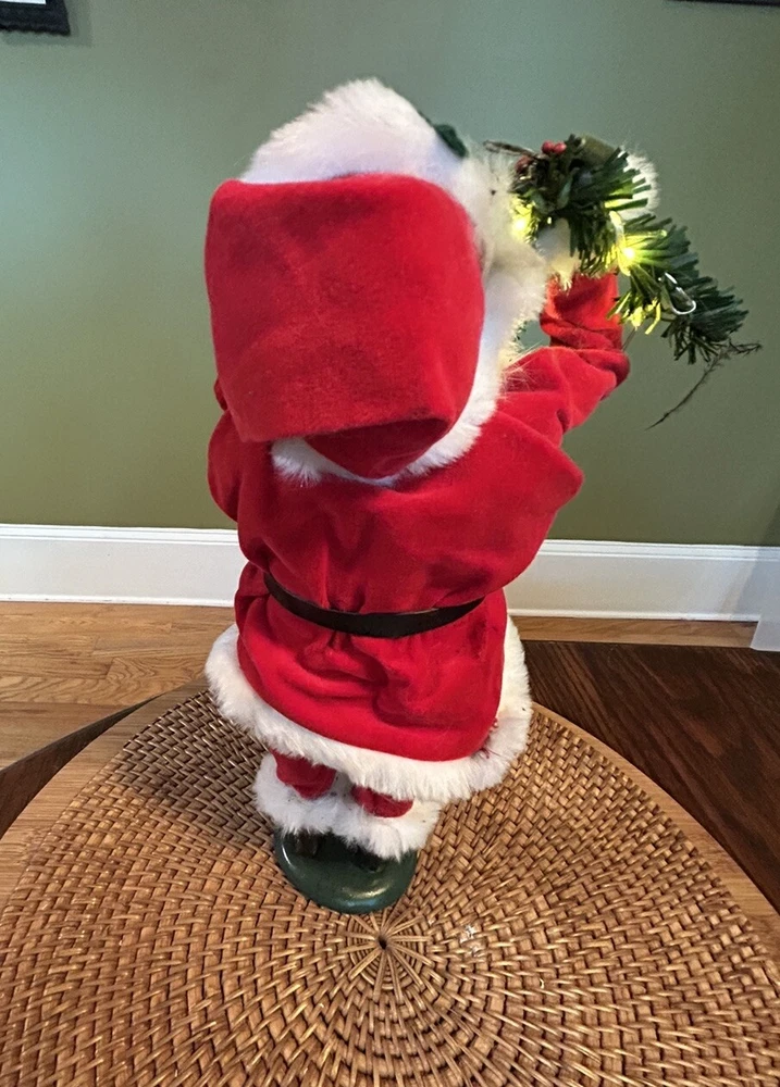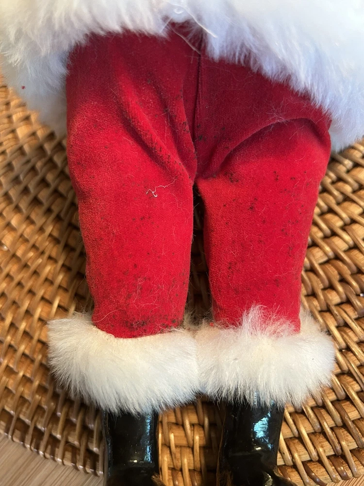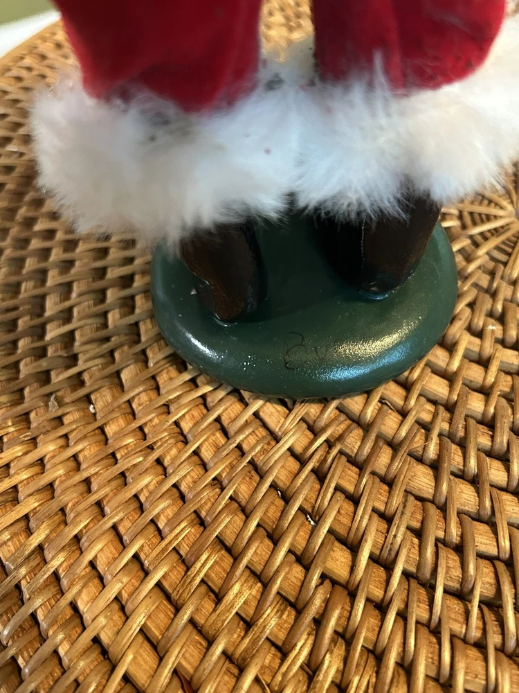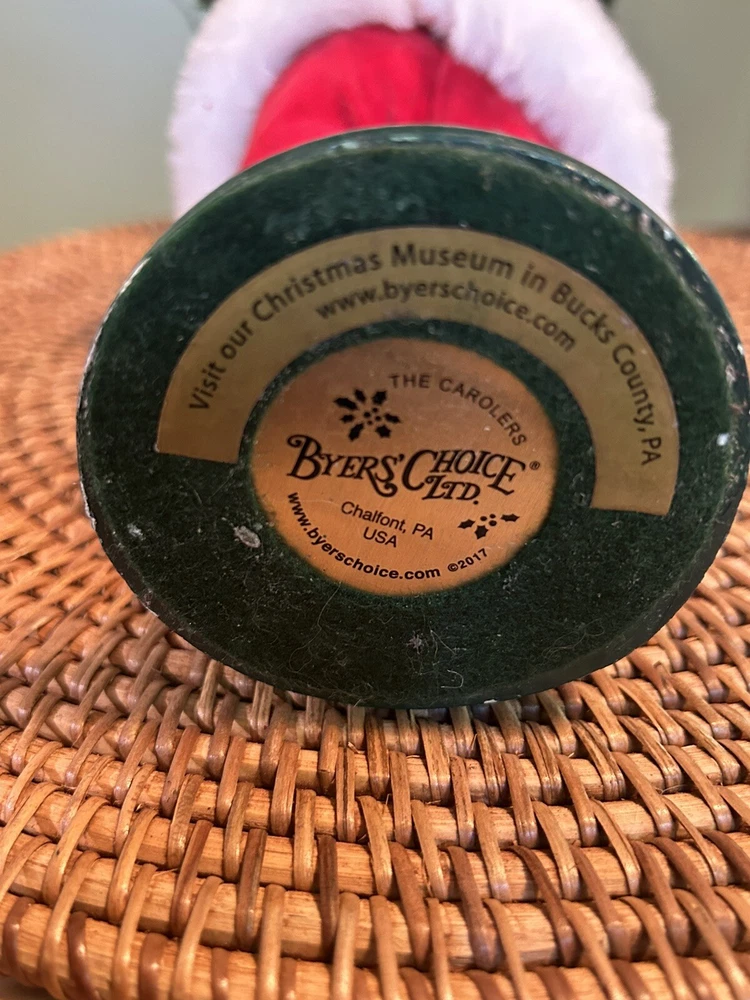 This product is a handmade 2017 Byers Choice LTD Santa Claus figurine made of mixed materials. The Santa is dressed in red velvet and holds "Lighted Greens". It is a Christmas-themed collectible item that was manufactured in the United States.