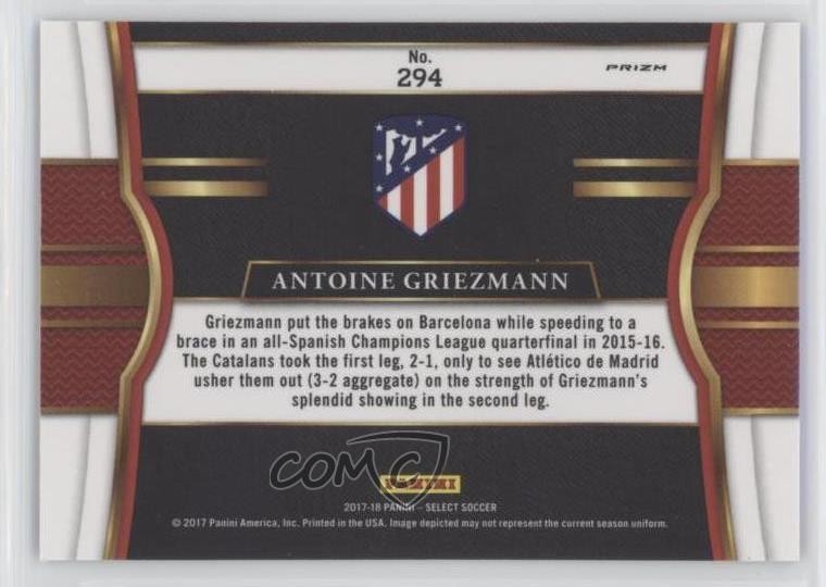 2017-18 Panini Select - [Base] - Checkerboard Prizm #294 Field Level - Antoine Griezmann - Soccer Card - Featuring the Atletico Madrid - Featuring Antoine Griezmann Search for more: 2017-18 Panini Select Search for more: 2017-18 Panini Select - [Base] - Checkerboard Prizm View all of our Listings Auctions Buy It Now About Us Located in the beautiful Pacific Northwest, COMC (Check Out My Cards) is the world's largest consignment service for trading card singles. More than 10,000 people have used our consignment service to list over 50 million trading cards. Find out how we can help you consign your items on eBay by contacting us through eBay messaging. COMC -- "The Safe & Easy Way to Buy & Sell" Representative Image - Select Specific Item above to see image of actual item Representative Image - Select Specific Item above to see image of actual item Raw Condition for Modern Cards Unless otherwise noted, raw modern cards are listed in Near Mint-Mint condition or better. A NM-MT card appears to be Mint at first glance, but upon closer inspection, may exhibit some of the following: minor print defects (e.g. roller marks, print line, dimple), minor scratches, slight edge wear, and slight corner wear. Centering is clearly visible in the images provided and does not factor into our condition assessment. Raw Condition for Vintage Cards Unless otherwise noted, raw vintage cards are listed in Excellent condition or better. An EX card may exhibit some of the following: minor rounding of corners, surface wear, print defects, light scratches, and slight edge wear/chipping. Centering is clearly visible in the images provided and does not factor into our condition assessment. Domestic Shipping Combined shipping for multiple items is available. To receive combined shipping, please ensure all desired items are in your eBay shopping cart before proceeding to checkout. eBay limits orders to 40 items per order. We automatically combine multiple orders placed on the same day. If you place multiple orders on the same day, please contact us to request a refund of applicable shipping costs. Signature confirmation may be required on invoices over $400. All cards are protected and shipped securely. International Shipping COMC offers eBay's International Shipping (EIS) for international orders under $2,500* (see country exceptions below). All duties and import fees are paid at checkout; in the rare event that there are additional import fees upon delivery, these are borne by the buyer. EIS packages route through a shipping hub in Erlanger, KY before shipping to their final destination. Please note that EIS does not allow for combined shipments. The shipping rates are determined by eBay and cannot be adjusted. *Maximum sale price exceptions: Colombia, Kuwait ($2,000); Taiwan ($1,539); Chile, Costa Rica, Guatemala, Honduras, Trinidad and Tobago ($1,000); Antigua and Barbuda, Aruba, Belize, Dominica, Grenada, Philippines, Saint Kitts and Nevis, Saint Lucia, Montserrat, Turks and Caicos Islands ($500); Dominican Republic, El Salvador ($200). Please request a shipping quote through eBay messaging for orders that exceed the maximum sale price supported by eBay's International Shipping. You will be responsible for all duties and import fees for international orders shipped outside the EIS. All cards are protected and shipped securely. Payment COMC does not accept offers on our cards through our eBay storefront. COMC utilizes eBay’s managed payments system. If you are experiencing difficulties making a payment, please contact eBay for assistance. Return Policy Returns are only accepted on the rare occasion the item is not as described. If you are making a return, please initiate the return process through eBay so a mailing label can be provided for you. Prior to listing, our expert team carefully assessed this item to represent it accurately. Please review the description and high-definition images prior to purchasing to ensure this item meets your satisfaction. We welcome you to contact us if you have further questions about this item. Trust and Integrity COMC carefully assesses each item consigned to us to prevent fraudulent items from entering the marketplace. If you believe an item offered on COMC may be fraudulent, please contact us with details so we can investigate the issue. Items we determine are outside our supported items policy may be removed. Last Modified: 11/21/2025 7:24:38 AM PDT