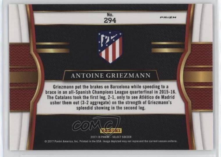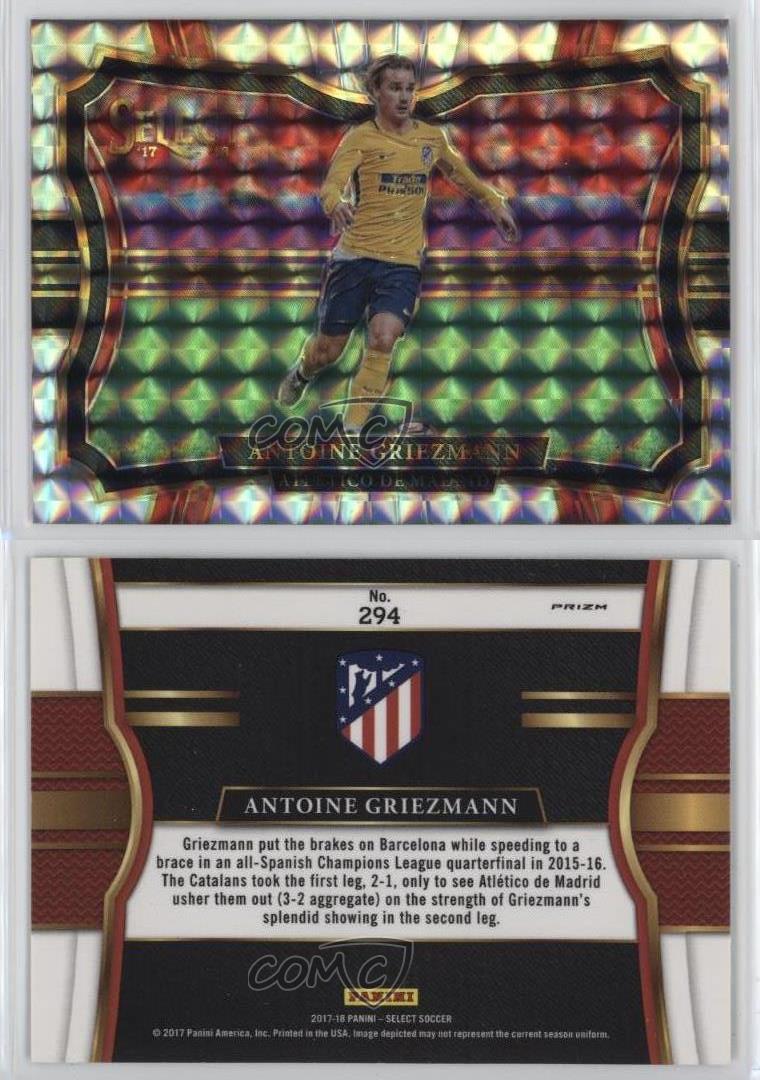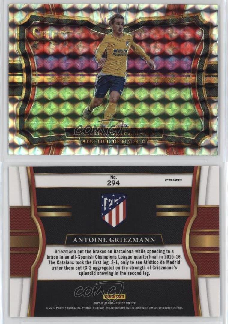 2017-18 Panini Select - [Base] - Silver Prizm #294 Field Level - Antoine Griezmann - Soccer Card - Featuring the Atletico Madrid - Featuring Antoine Griezmann Search for more: 2017-18 Panini Select Search for more: 2017-18 Panini Select - [Base] - Silver Prizm View all of our Listings Auctions Buy It Now About Us Located in the beautiful Pacific Northwest, COMC (Check Out My Cards) is the world's largest consignment service for trading card singles. More than 10,000 people have used our consignment service to list over 50 million trading cards. Find out how we can help you consign your items on eBay by contacting us through eBay messaging. COMC -- "The Safe & Easy Way to Buy & Sell" Representative Image - Select Specific Item above to see image of actual item Representative Image - Select Specific Item above to see image of actual item Raw Condition for Modern Cards Unless otherwise noted, raw modern cards are listed in Near Mint-Mint condition or better. A NM-MT card appears to be Mint at first glance, but upon closer inspection, may exhibit some of the following: minor print defects (e.g. roller marks, print line, dimple), minor scratches, slight edge wear, and slight corner wear. Centering is clearly visible in the images provided and does not factor into our condition assessment. Raw Condition for Vintage Cards Unless otherwise noted, raw vintage cards are listed in Excellent condition or better. An EX card may exhibit some of the following: minor rounding of corners, surface wear, print defects, light scratches, and slight edge wear/chipping. Centering is clearly visible in the images provided and does not factor into our condition assessment. Domestic Shipping Combined shipping for multiple items is available. To receive combined shipping, please ensure all desired items are in your eBay shopping cart before proceeding to checkout. eBay limits orders to 40 items per order. We automatically combine multiple orders placed on the same day. If you place multiple orders on the same day, please contact us to request a refund of applicable shipping costs. Signature confirmation may be required on invoices over $400. All cards are protected and shipped securely. International Shipping COMC offers eBay's International Shipping (EIS) for international orders under $2,500* (see country exceptions below). All duties and import fees are paid at checkout; in the rare event that there are additional import fees upon delivery, these are borne by the buyer. EIS packages route through a shipping hub in Erlanger, KY before shipping to their final destination. Please note that EIS does not allow for combined shipments. The shipping rates are determined by eBay and cannot be adjusted. *Maximum sale price exceptions: Colombia, Kuwait ($2,000); Taiwan ($1,539); Chile, Costa Rica, Guatemala, Honduras, Trinidad and Tobago ($1,000); Antigua and Barbuda, Aruba, Belize, Dominica, Grenada, Philippines, Saint Kitts and Nevis, Saint Lucia, Montserrat, Turks and Caicos Islands ($500); Dominican Republic, El Salvador ($200). Please request a shipping quote through eBay messaging for orders that exceed the maximum sale price supported by eBay's International Shipping. You will be responsible for all duties and import fees for international orders shipped outside the EIS. All cards are protected and shipped securely. Payment COMC does not accept offers on our cards through our eBay storefront. COMC utilizes eBay’s managed payments system. If you are experiencing difficulties making a payment, please contact eBay for assistance. Return Policy Returns are only accepted on the rare occasion the item is not as described. If you are making a return, please initiate the return process through eBay so a mailing label can be provided for you. Prior to listing, our expert team carefully assessed this item to represent it accurately. Please review the description and high-definition images prior to purchasing to ensure this item meets your satisfaction. We welcome you to contact us if you have further questions about this item. Trust and Integrity COMC carefully assesses each item consigned to us to prevent fraudulent items from entering the marketplace. If you believe an item offered on COMC may be fraudulent, please contact us with details so we can investigate the issue. Items we determine are outside our supported items policy may be removed. Last Modified: 11/21/2025 8:04:48 AM PDT