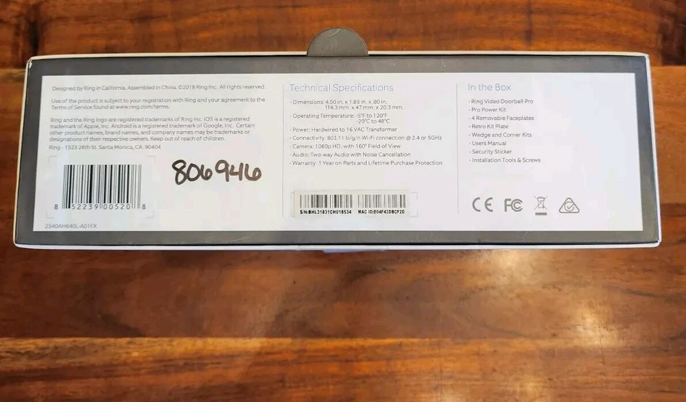 Items Included:Video DoorbellSmart Home Compatibility:Amazon Alexa, Google HomeType:CameraColor:MulticolorPower Source:HardwiredBrand:RingYear Manufactured:2018Connectivity:Wired