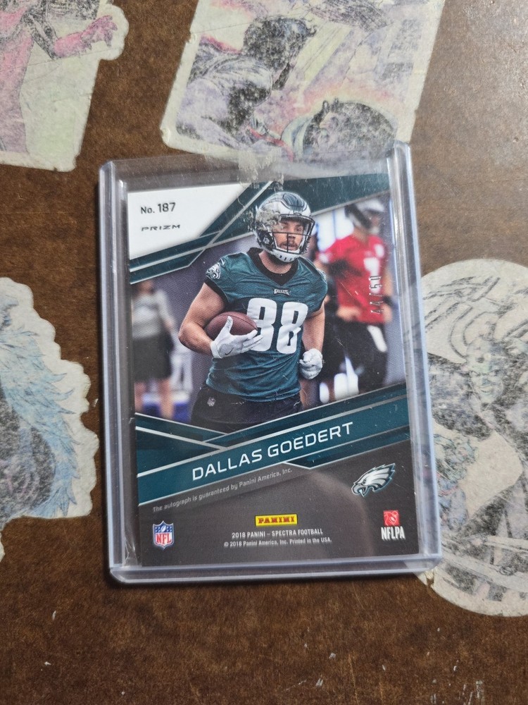 The 2018 Panini Spectra Rookie Autographs Dallas Goedert Pink Prism trading card is a highly sought-after collectible for fans of the Philadelphia Eagles and the National Football League. This autographed card features a pink prism design, adding a unique and eye-catching element to the piece. Manufactured by Panini, this original sports trading card is a part of the rookie autographs set, making it a valuable addition to any football card collection. With its near mint or better condition, this card is a must-have for any football enthusiast looking to own a piece of NFL history.
