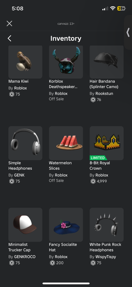 2018 Account Account Username: carvxzz -Builder’s Club Badge + Hat -Voice Chat and Camera Face Tracking Feature, 13+ Account -Account includes KORBLOX Morph -Account Has 4,999 Robux Worth Limited (8-Bit Royal Crown) -Also Has Sleek Sunglasses going for 1,500 Robux -Has 27 Bought Face Accessories -Has 26 Bought Head Accesories -Has 8 Bought Neck Accesories -Has 3 Bought Shoulder Accesories -Has 4 Bought Front Accesories -Has 10 Bought Back Accesories -Has 4 Bought Waist Accesories -Has 4 Bought Gear Accesories -Has 12 Bought Hairs -Has 27 Bought Animated Faces -Has 3 Bought Avatar Animation Packs -Has the Quiet Waves Emote and The Offsale ‘Burberry Lola Attitude - Bloom’ Emote -60+ Bought Classic Shirts -30+ Bought Classic Pants -Both Limiteds of The Catrin Dia de Muertos Mask and Catrina Dia de Muertos Mask for 92 and 90 Robux -Has the Offsale Lugar Pistol -Has Multiple Offsale Classic Faces: Vampire, Check It, Winky, Grr, Freckles, and Drool -Currently Has 74 Robux When Each Bullet has the word ‘bought’ in it, it is referring to the quantity of items that were bought with ROBUX, not free items. There are many more limited edition accesories that were free and are offsale. I simply do not play as much Roblox as I used to, and I want someone else to carry on my account and enjoy it themselves. NOT SOLD YET AS OF 8/21/24 I am looking at around a minimum of $95USD-$120USD, mostly because of all the money spent on it and the tons of customizable items for your character.