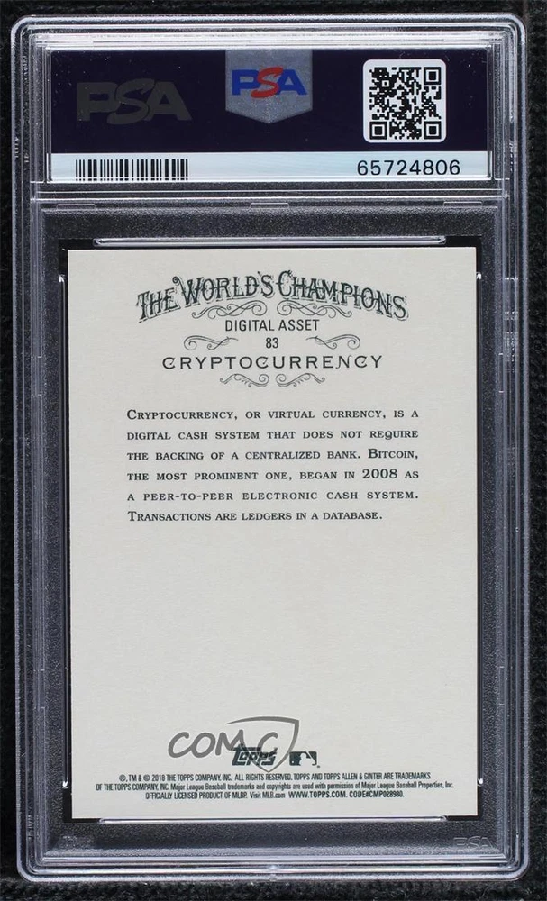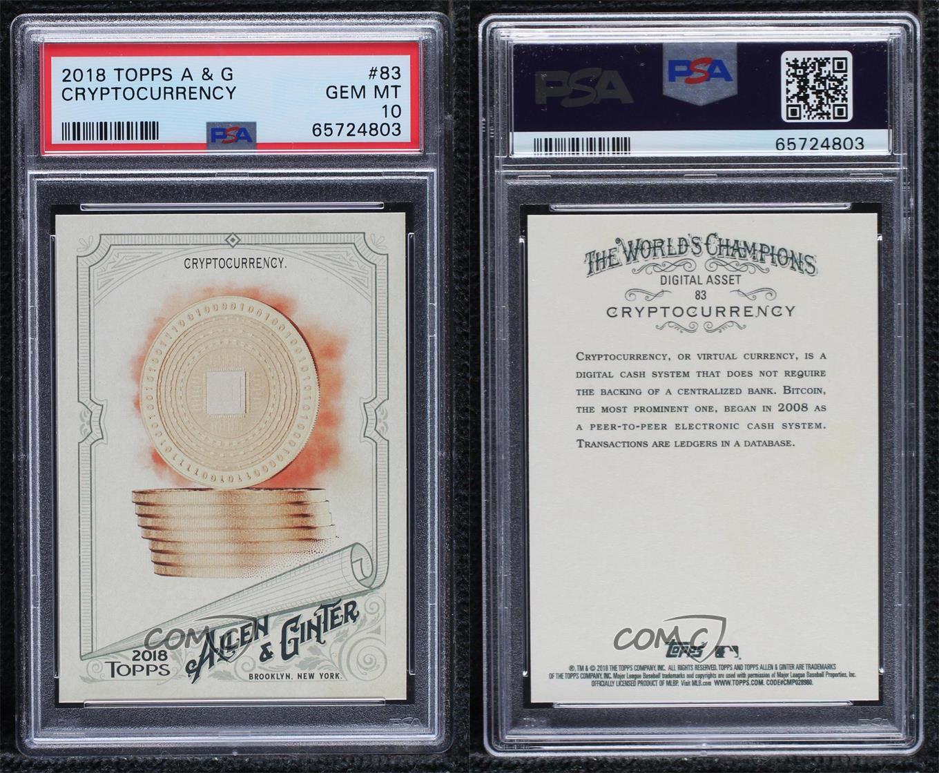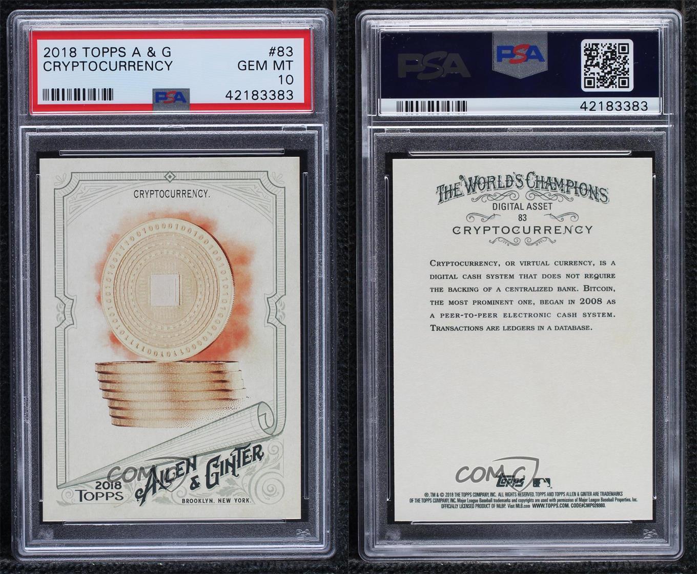 2018 Topps Allen & Ginter - [Base] #83 Cryptocurrency Graded PSA 10 GEM MT - Baseball Card Search for more: 2018 Topps Allen & Ginter Search for more: 2018 Topps Allen & Ginter - [Base] View all of our Listings Auctions Buy It Now About Us Located in the beautiful Pacific Northwest, COMC (Check Out My Cards) is the world's largest consignment service for trading card singles. More than 10,000 people have used our consignment service to list over 50 million trading cards. We currently house 20 million cards, each listed for sale with front and back images of the actual card. Find out how we can help you consign your items on eBay by contacting us through eBay messaging. COMC -- "The Safe & Easy Way to Buy & Sell" Representative Image - Select Specific Item above to see image of actual item Representative Image - Select Specific Item above to see image of actual item Raw Condition for Modern Cards Unless otherwise noted, raw modern cards are listed in Near Mint-Mint condition or better. A NM-MT card appears to be Mint at first glance, but upon closer inspection, may exhibit some of the following: minor print defects (e.g. roller marks, print line, dimple), minor scratches, slight edge wear, and slight corner wear. Centering is clearly visible in the images provided and does not factor into our condition assessment. Raw Condition for Vintage Cards Unless otherwise noted, raw vintage cards are listed in Excellent condition or better. An EX card may exhibit some of the following: minor rounding of corners, surface wear, print defects, light scratches, and slight edge wear/chipping. Centering is clearly visible in the images provided and does not factor into our condition assessment. Domestic Shipping Combined shipping for multiple items is available. To receive combined shipping, please ensure all desired items are in your eBay shopping cart before proceeding to checkout. eBay limits orders to 40 items per order. We automatically combine multiple orders placed on the same day. If you place multiple orders on the same day, please contact us to request a refund of applicable shipping costs. Signature confirmation may be required on invoices over $400. Raw cards are shipped in toploaders. International Shipping COMC offers eBay's International Shipping (EIS) for international orders under $2,500* (see country exceptions below). All duties and import fees are paid at checkout; in the rare event that there are additional import fees upon delivery, these are borne by the buyer. EIS packages route through a shipping hub in Erlanger, KY before shipping to their final destination. Please note that EIS does not allow for combined shipments. The shipping rates are determined by eBay and cannot be adjusted. *Maximum sale price exceptions: Colombia, Kuwait ($2,000); Taiwan ($1,539); Chile, Costa Rica, Guatemala, Honduras, Trinidad and Tobago ($1,000); Antigua and Barbuda, Aruba, Belize, Dominica, Grenada, Philippines, Saint Kitts and Nevis, Saint Lucia, Montserrat, Turks and Caicos Islands ($500); Dominican Republic, El Salvador ($200). Please request a shipping quote through eBay messaging for orders that exceed the maximum sale price supported by eBay's International Shipping. You will be responsible for all duties and import fees for international orders shipped outside the EIS. Raw cards are shipped in toploaders. Payment COMC does not accept offers on our cards through our eBay storefront. COMC utilizes eBay’s managed payments system. If you are experiencing difficulties making a payment, please contact eBay for assistance. Return Policy Returns are only accepted on the rare occasion the item is not as described. If you are making a return, please initiate the return process through eBay so a mailing label can be provided for you. Prior to listing, our expert team carefully assessed this item to represent it accurately. Please review the description and high-definition images prior to purchasing to ensure this item meets your satisfaction. We welcome you to contact us if you have further questions about this item. Trust and Integrity COMC carefully assesses each item consigned to us to prevent fraudulent items from entering the marketplace. If you believe an item offered on COMC may be fraudulent, please contact us with details so we can investigate the issue. Items we determine are outside our supported items policy may be removed. Last Modified: 11/16/2024 12:06:58 PM PDT