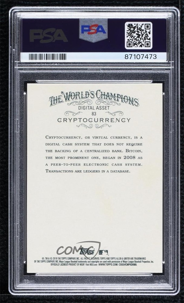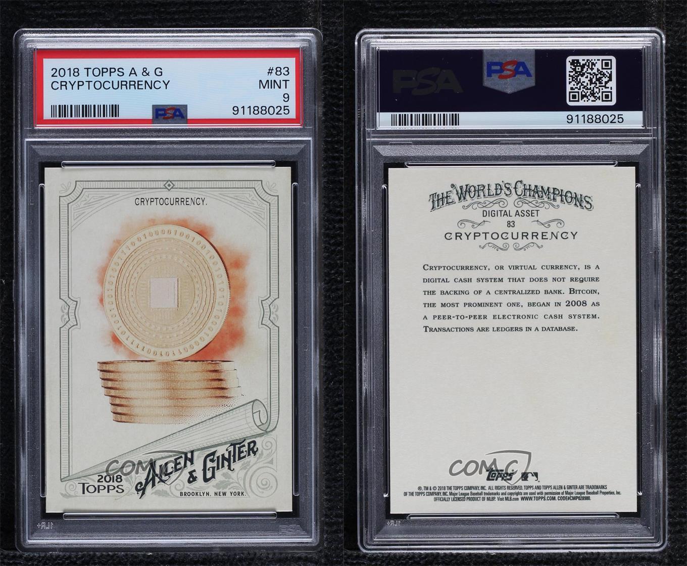 2018 Topps Allen & Ginter - [Base] #83 Cryptocurrency Graded PSA 9 MINT - Baseball Card Search for more: 2018 Topps Allen & Ginter Search for more: 2018 Topps Allen & Ginter - [Base] View all of our Listings Auctions Buy It Now About Us Located in the beautiful Pacific Northwest, COMC (Check Out My Cards) is the world's largest consignment service for trading card singles. More than 10,000 people have used our consignment service to list over 50 million trading cards. Find out how we can help you consign your items on eBay by contacting us through eBay messaging. COMC -- "The Safe & Easy Way to Buy & Sell" Representative Image - Select Specific Item above to see image of actual item Representative Image - Select Specific Item above to see image of actual item Raw Condition for Modern Cards Unless otherwise noted, raw modern cards are listed in Near Mint-Mint condition or better. A NM-MT card appears to be Mint at first glance, but upon closer inspection, may exhibit some of the following: minor print defects (e.g. roller marks, print line, dimple), minor scratches, slight edge wear, and slight corner wear. Centering is clearly visible in the images provided and does not factor into our condition assessment. Raw Condition for Vintage Cards Unless otherwise noted, raw vintage cards are listed in Excellent condition or better. An EX card may exhibit some of the following: minor rounding of corners, surface wear, print defects, light scratches, and slight edge wear/chipping. Centering is clearly visible in the images provided and does not factor into our condition assessment. Domestic Shipping Combined shipping for multiple items is available. To receive combined shipping, please ensure all desired items are in your eBay shopping cart before proceeding to checkout. eBay limits orders to 40 items per order. We automatically combine multiple orders placed on the same day. If you place multiple orders on the same day, please contact us to request a refund of applicable shipping costs. Signature confirmation may be required on invoices over $400. All cards are protected and shipped securely. International Shipping COMC offers eBay's International Shipping (EIS) for international orders under $2,500* (see country exceptions below). All duties and import fees are paid at checkout; in the rare event that there are additional import fees upon delivery, these are borne by the buyer. EIS packages route through a shipping hub in Erlanger, KY before shipping to their final destination. Please note that EIS does not allow for combined shipments. The shipping rates are determined by eBay and cannot be adjusted. *Maximum sale price exceptions: Colombia, Kuwait ($2,000); Taiwan ($1,539); Chile, Costa Rica, Guatemala, Honduras, Trinidad and Tobago ($1,000); Antigua and Barbuda, Aruba, Belize, Dominica, Grenada, Philippines, Saint Kitts and Nevis, Saint Lucia, Montserrat, Turks and Caicos Islands ($500); Dominican Republic, El Salvador ($200). Please request a shipping quote through eBay messaging for orders that exceed the maximum sale price supported by eBay's International Shipping. You will be responsible for all duties and import fees for international orders shipped outside the EIS. All cards are protected and shipped securely. Payment COMC does not accept offers on our cards through our eBay storefront. COMC utilizes eBay’s managed payments system. If you are experiencing difficulties making a payment, please contact eBay for assistance. Return Policy Returns are only accepted on the rare occasion the item is not as described. If you are making a return, please initiate the return process through eBay so a mailing label can be provided for you. Prior to listing, our expert team carefully assessed this item to represent it accurately. Please review the description and high-definition images prior to purchasing to ensure this item meets your satisfaction. We welcome you to contact us if you have further questions about this item. Trust and Integrity COMC carefully assesses each item consigned to us to prevent fraudulent items from entering the marketplace. If you believe an item offered on COMC may be fraudulent, please contact us with details so we can investigate the issue. Items we determine are outside our supported items policy may be removed. Last Modified: 11/25/2025 1:57:15 AM PDT