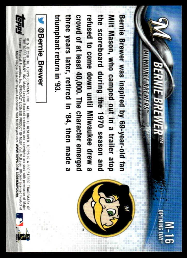 Team: Brewers Set: 2018 Opening Day Autographed: No Graded: No Card Size: Standard League: Major League (MLB) Card Number: M-16 Sport: Baseball Player/Athlete: Bernie Brewer Card Condition: Near Mint or Better Language: English Type: Sports Trading Card Card Thickness: 20 Pt. Material: Card Stock Country/Region of Manufacture: Unknown Card Name: 2018 Topps Opening Day Mike Trout #BOD-MT Angles Year Manufactured: 2018 Original/Licensed Reprint: Original