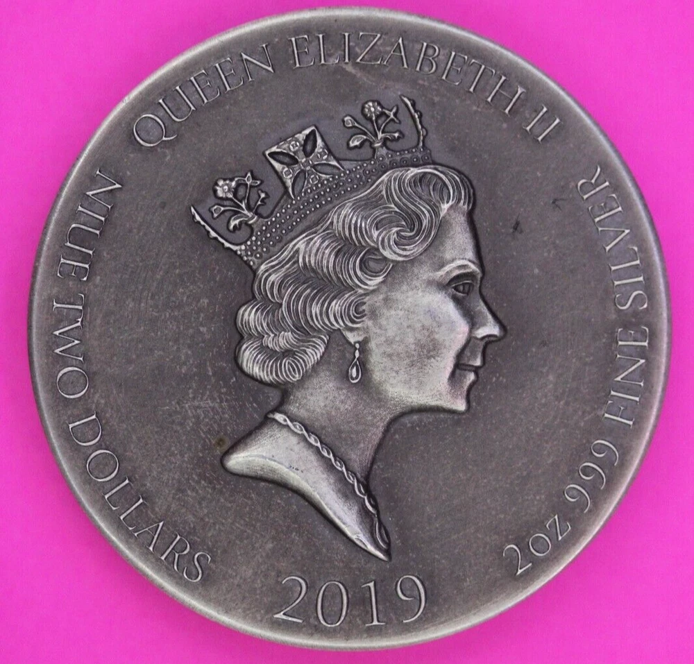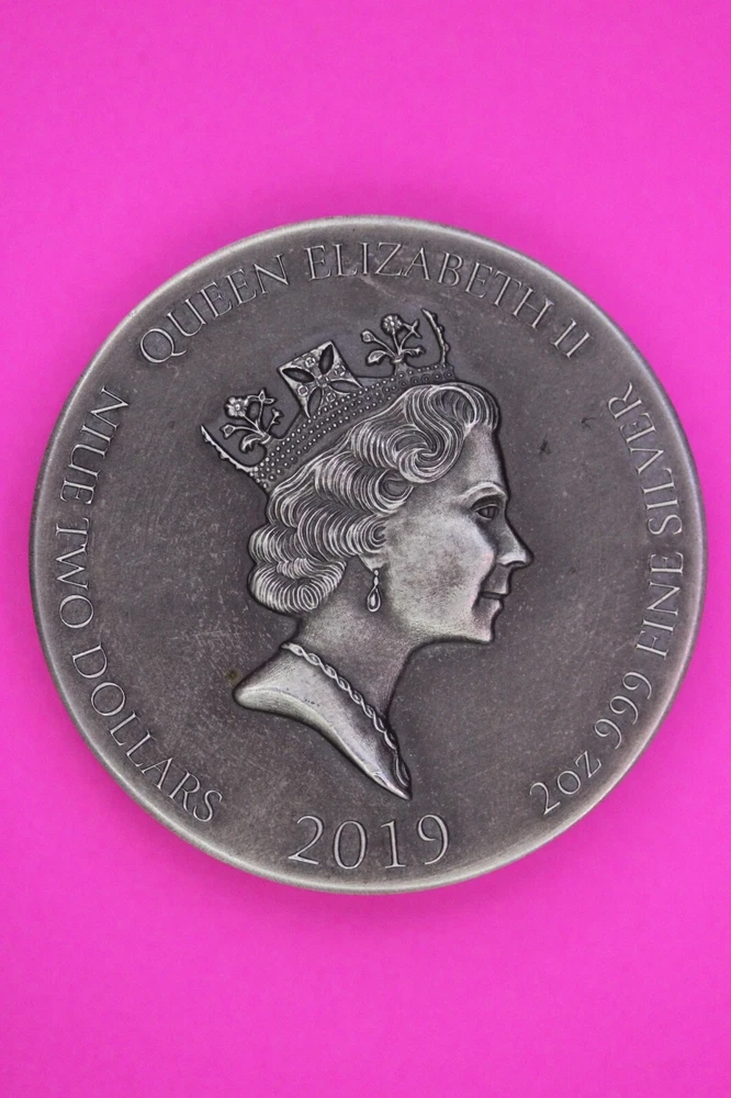 Composition: Silver Coin: Niue Country/Region of Manufacture: Niue Strike Type: Antique Year: 2019 Brand/Mint: New Zealand Mint Certification: Uncertified Grade: Ungraded Precious Metal Content per Unit: 2 oz