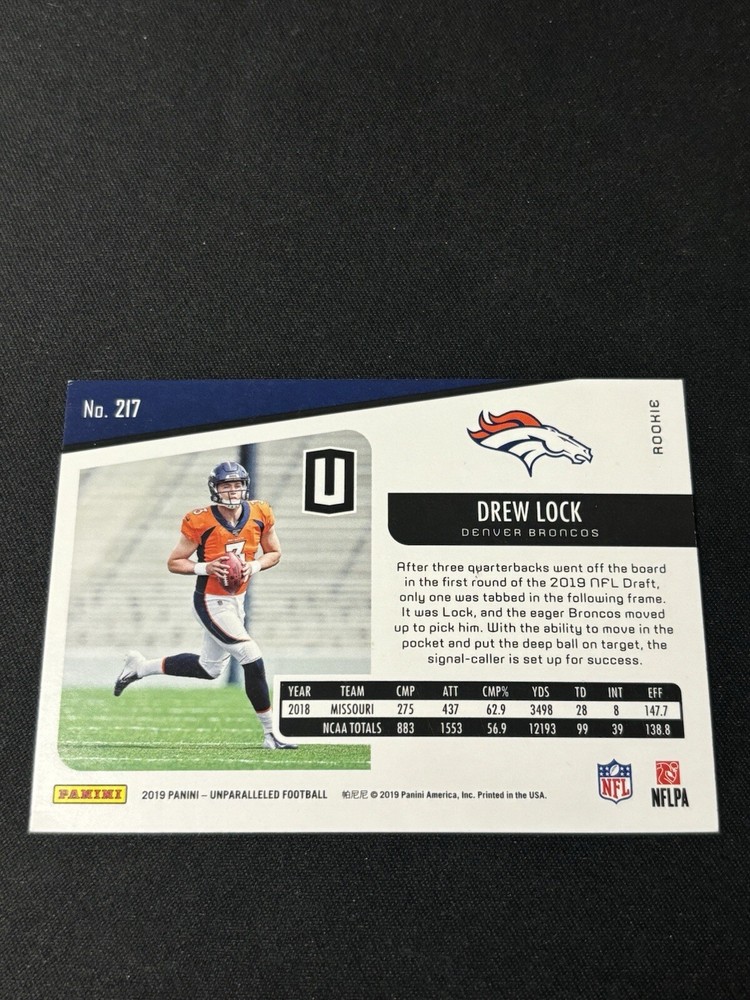 The 2019 Unparalleled Drew Lock Rookie Card is a sports trading card manufactured by Panini as part of their 2019 Panini Unparalleled set. This original card features Drew Lock, a rookie player from the Denver Broncos, and is card number 217 in the set. The card is sought after by collectors and fans of football trading cards, especially those interested in adding rookie cards to their collection. Additionally, this card holds value for its association with a promising player like Drew Lock.