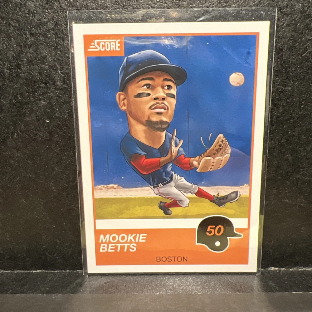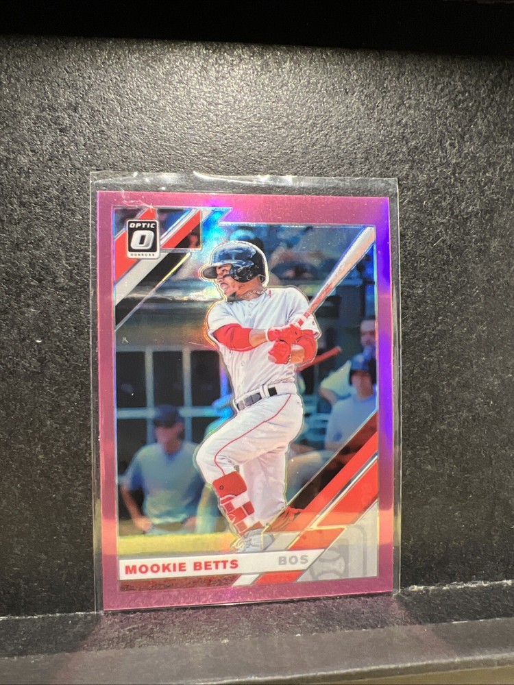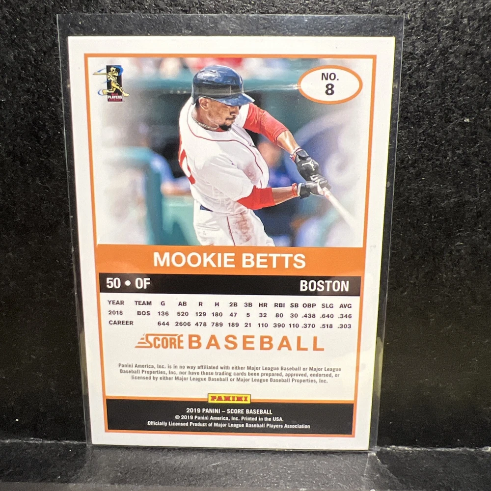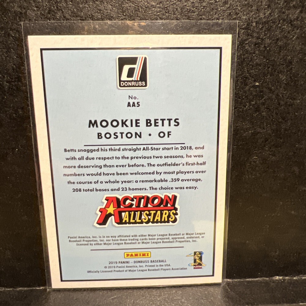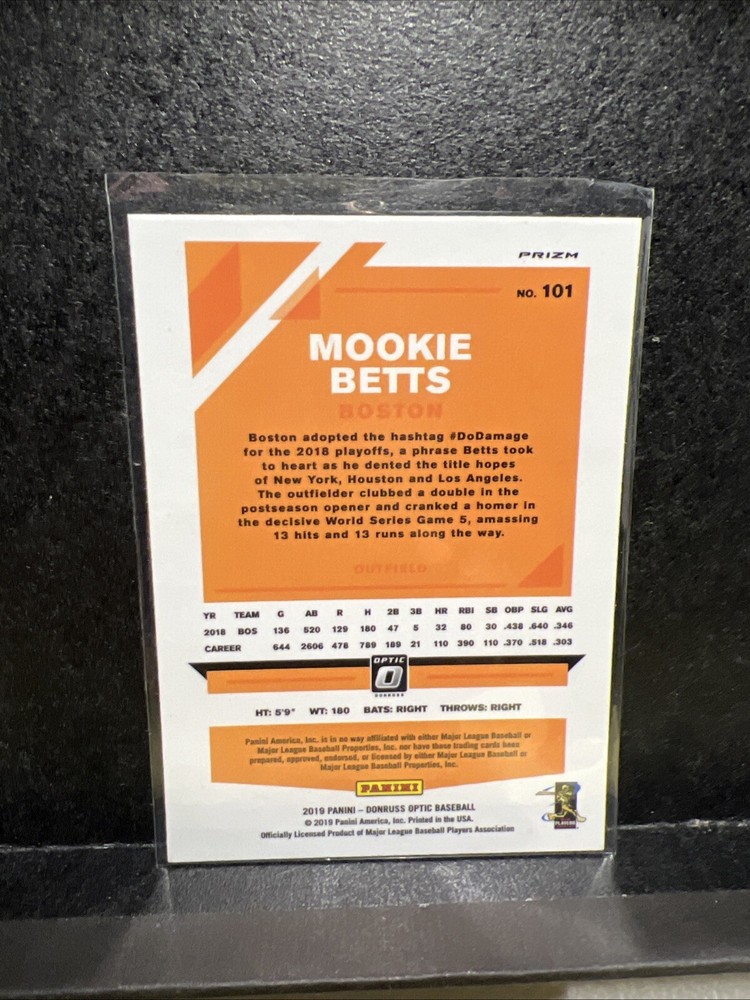 The product is a 2019 trading card lot featuring Mookie Betts of the Boston Red Sox. It includes cards from the Donruss Optic, Donruss Baseball, and Score sets, with a total of 3 cards. The cards are in English and manufactured by Panini, with features like inserts and parallels. The cards are original and not autographed, made of card stock, and pertain to the 2018 MLB season. (PWE#2716)