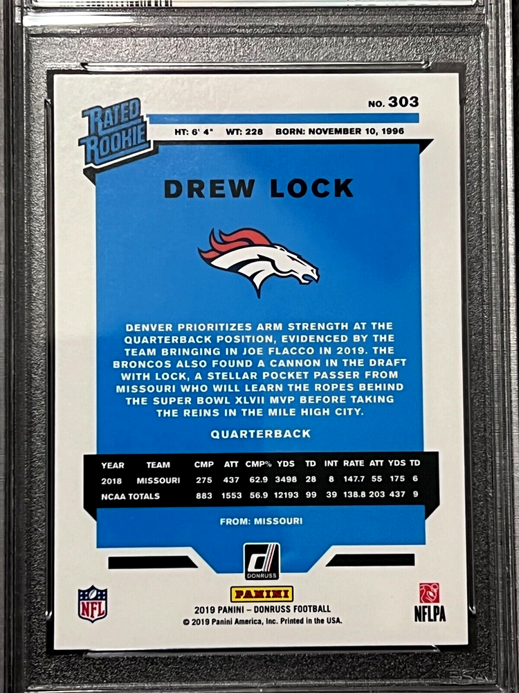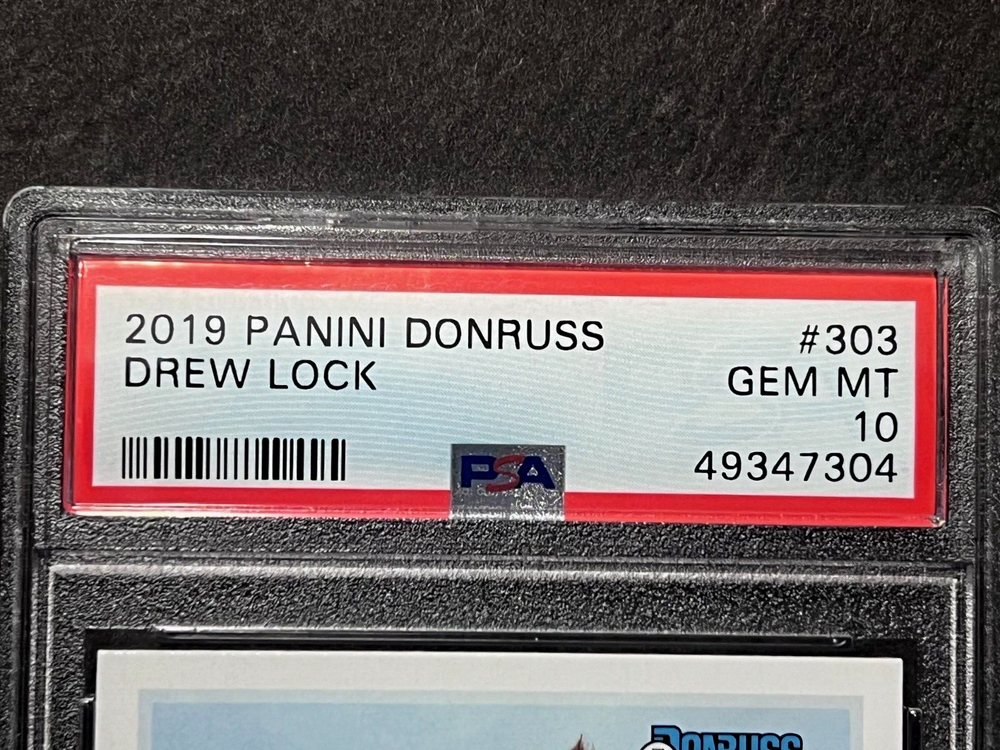 For the football enthusiasts out there, we have a special treat for you. Check out this 2019 Panini Donruss #303, featuring the rookie Drew Lock of the then Denver Broncos. He is currently the backup QB for the NY Giants. This sports trading card is a must-have for any collector, with its exclusive and pristine slab features. The card has been graded as PSA10 (MINT), ensuring its authenticity and value. It belongs to the National Football League (NFL) league and is part of the 2019 season set. Don't miss out on the chance to own this highly sought-after card, perfect for adding to your sports trading card collection.