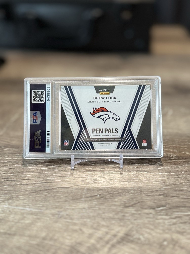 Capture a piece of football history with the 2019 Panini Donruss Elite Pen Pals card featuring Drew Lock, card number PP-DL. This sought-after rookie card is an essential addition for collectors and fans alike, highlighting the promising talent of the Denver Broncos quarterback. The card is part of the Pen Pals insert set, which is renowned for its distinct design and appeal among enthusiasts. Not only does this card boast an authentic autograph from Drew Lock, but it also comes graded with a PSA score of 9, ensuring its premium quality. The base parallel variety adds an extra layer of desirability, making it a standout piece in any NFL collection. Whether you're a fan of the sport or a serious collector, this card is sure to be a valuable asset to your assortment.