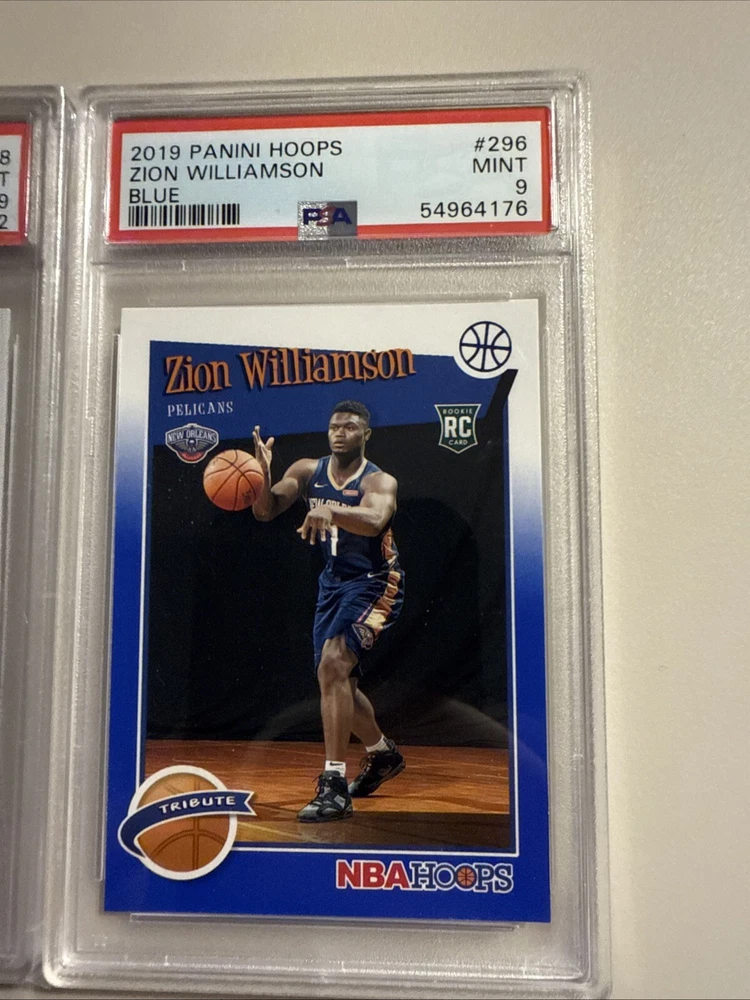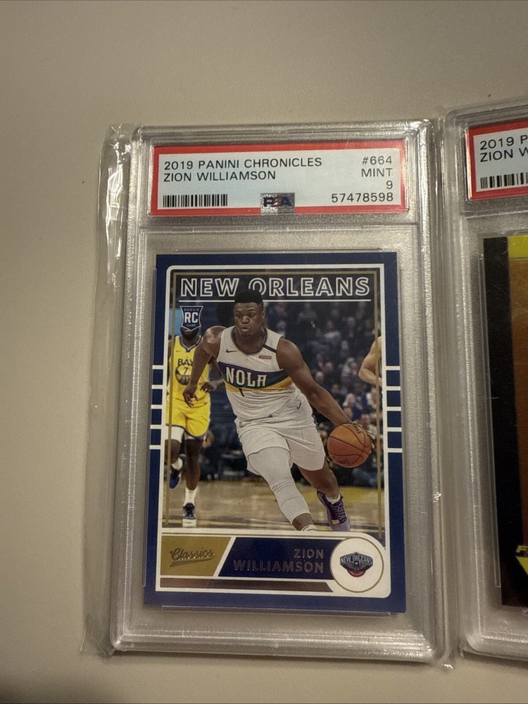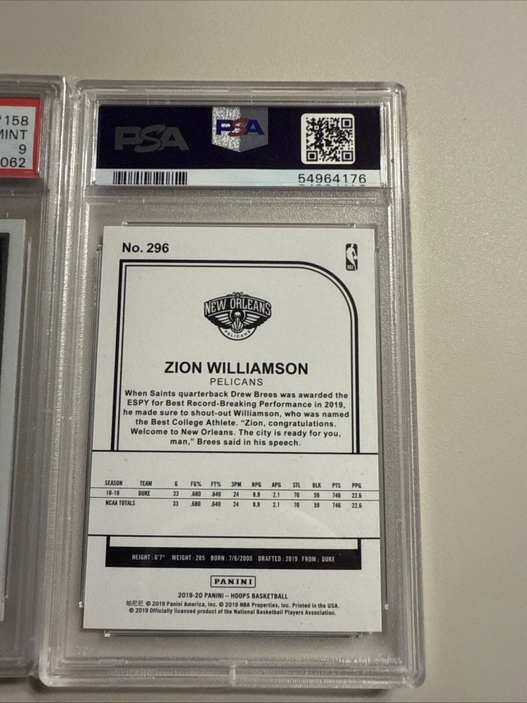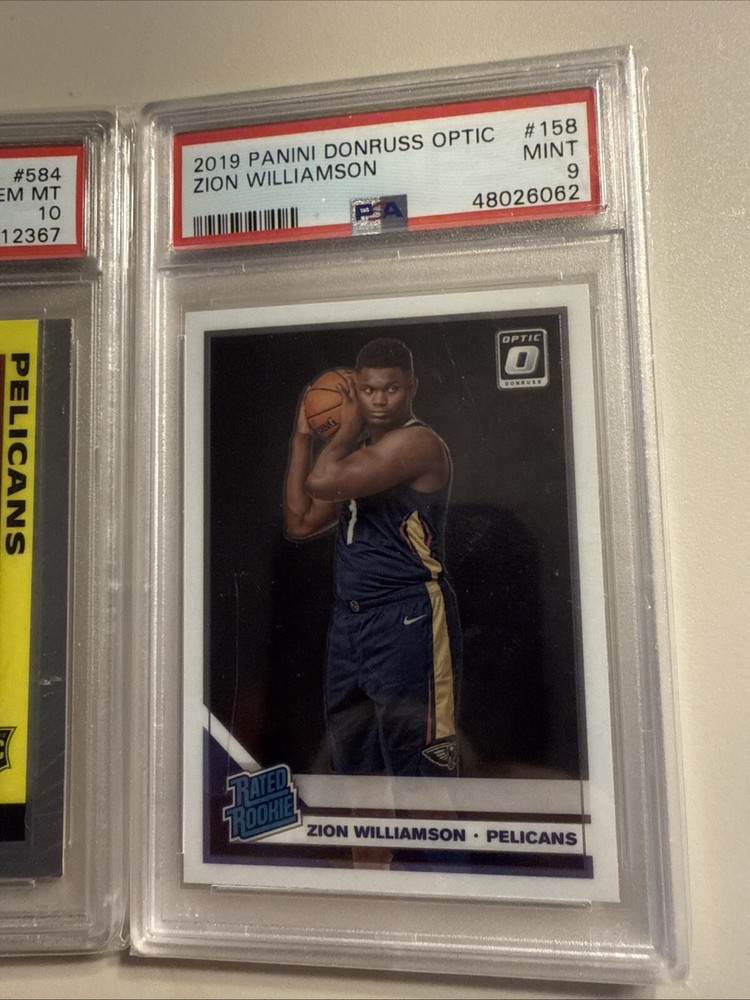 The product is a 2019 Panini Donruss Optic trading card featuring Zion Williamson, a rookie player from Duke Blue Devils and New Orleans Pelicans in the NBA. The card is numbered 158 and has been graded as a PSA 9, indicating it is in mint condition. This card is part of a lot of Zion Williamson cards from the 2019-20 season, offering collectors the chance to own a piece of memorabilia from this highly sought-after basketball player. 4 cards total 2019 Chronicles Rookie Card - psa 9 2019 Flux Rookie Card - psa 10 2019 Donruss Optic Rated Rookie - psa 9 2019 Hoops Rookie - psa 9