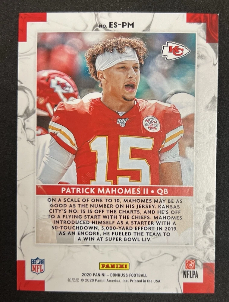 Team: Kansas City Chiefs Vintage: No Parallel/Variety: Insert Year Manufactured: 2020 Country/Region of Manufacture: United States Card Name: Patrick Mahomes II Card Number: ES-PM Type: Sports Trading Card Season: 2020 Original/Licensed Reprint: Original Card Size: Standard Language: English League: National Football League (NFL) Set: 2020 Panini Donruss Elite Manufacturer: Donruss Features: Insert Material: Card Stock Sport: Football Player/Athlete: Patrick Mahomes, Patrick Mahomes II Autographed: No Card Thickness: 20 Pt.