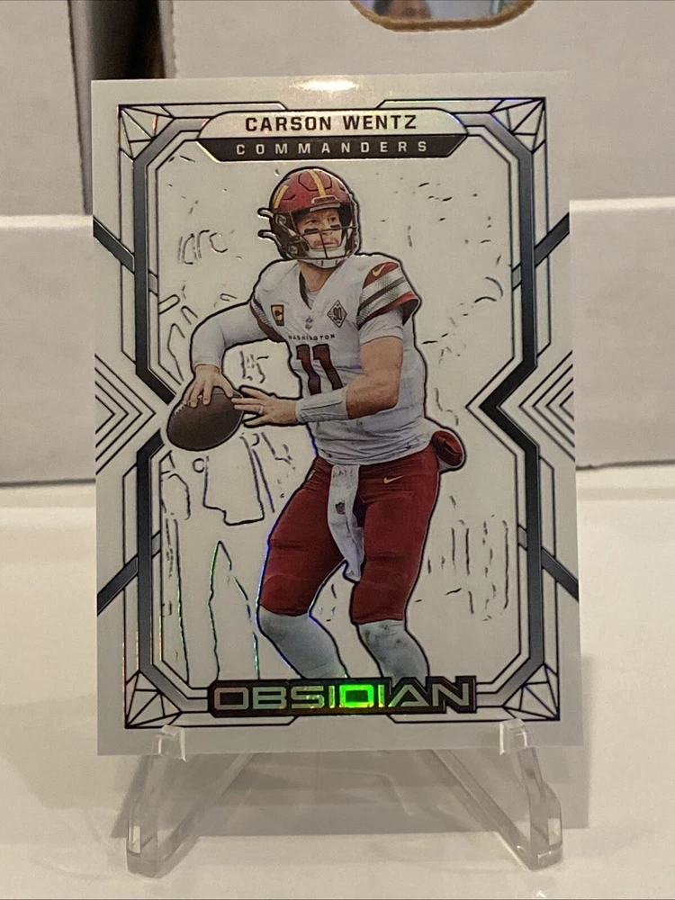 This 2020 Panini Obsidian trading card features Carson Wentz, the talented quarterback for the Philadelphia Eagles. The card is a true white contra SSP, with a hologram, short print, and exclusive insert features. It is an original and licensed reprint, with a card number of V20 and manufactured by Panini. The card is part of the National Football League (NFL) set, and is perfect for any football fan or collector. It is not autographed, but the electric etch white contrast design is stunning and makes this card a must-have. Don't miss your chance to add this rare and unique card to your collection today!
