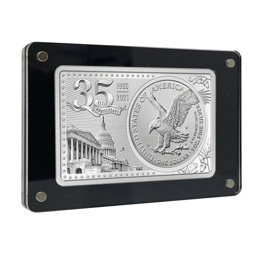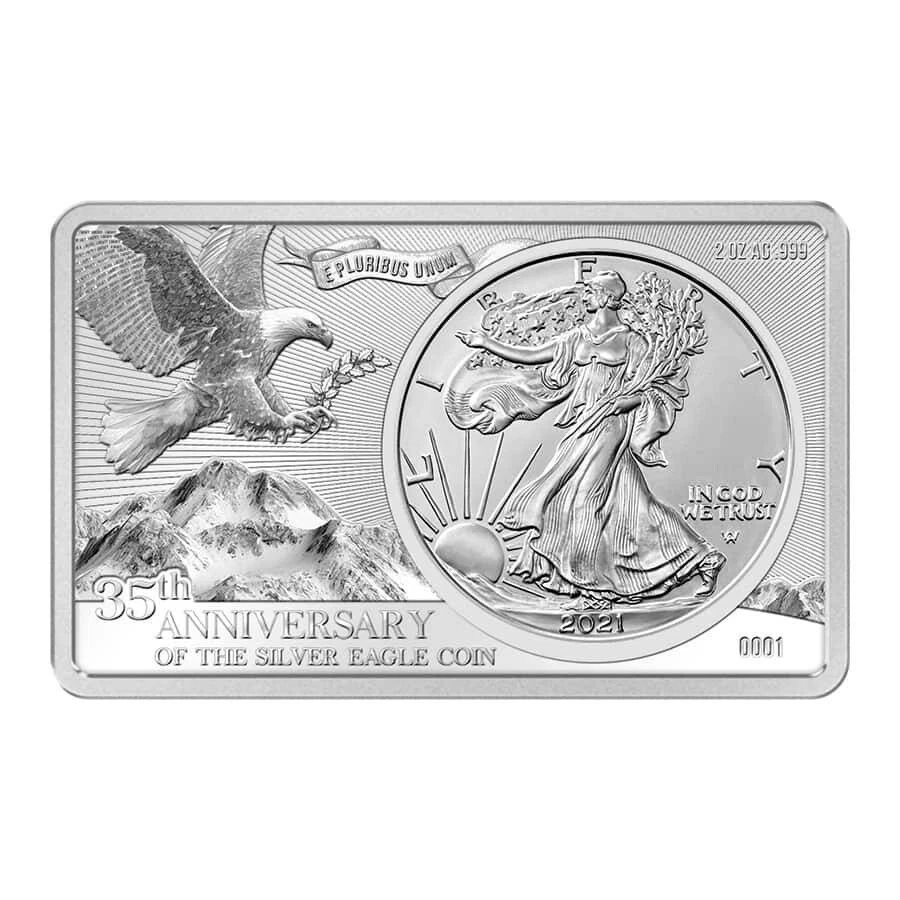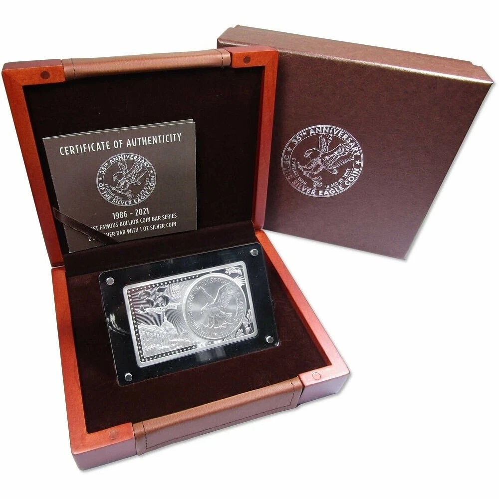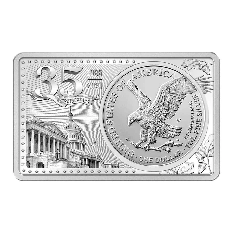 FREE SHIPPING ON DOMESTIC ORDERS New releases Deals Exclusives Bullion Gold Graded Licensed Standing behind our products & our name for over a century SINCE 1915 SHOP BY CATEGORY Animal Theme Art Coins Coin Sets Comics, Notes, & Foils Deals Famous Figures & Landmarks Gold Coins GR Reserve Exclusives Graded Coins Holiday Theme Licensed Products Lunar Calendar Nature Coins Premium Bullion Rare Certificate Numbers Shaped Coins Warriors & Gods Other PARTNERS & AFFILIATIONS STORE NEWSLETTER Add us to your Favorites and receive exclusive emails about new items and special promotions! Sign up 2021 American Silver Eagle 35th Anniversary Coin & Bar 3 oz Silver Set Product Description This bar and coin set contains one bar weighing 2 troy ounces and one coin weighing 1 troy ounce. Additionally, both the bar and coin were struck from .999 fine silver. The Silver Eagle coin, featuring the new reverse design, is housed as a removable insert within the larger silver bar. The designs on the obverse and reverse of the coin blend seamlessly into the surrounding bar’s design, causing the images to appear as one. The Brilliant Uncirculated Silver Coin and Proof Silver Bar display special features that will entice any collector. Hurry though, only 3,500 of these limited-mintage 3 oz Silver Eagle Coin & Bar Sets have been produced. The US Mint has set the bar high with this new 2021 Coin and Bar Set. For the first time ever, anti-counterfeiting technology has been added to a US Silver Eagle, and it was also implemented on the bar as well. These extra security measures include Micro-Text on the product’s surface and radial lines in the bar’s background. Another noteworthy enhancement is the inclusion of individualized serial numbers on each bar. The packaging impresses too — The 3 oz set arrives in a special magnetic holder, inside of a wood-and-leather box. Lastly, the limited mintage of 3,500 pays homage to the 35th Anniversary of the Silver Eagle’s introduction, so they won’t be available for long! The front of the 2 oz bar showcases a majestic bald eagle grasping an olive branch as it flies over a mountain range. The obverse of the Silver Eagle coin features Adolph A Weinman’s “Walking Liberty” design. Lady Liberty walks towards the sunrise while cradling oak and laurel branches in her left arm. The American flag is draped over her shoulders as she stretches her right arm towards the horizon. Inscriptions on the bar include “35th ANNIVERSARY OF THE SILVER EAGLE COIN” and others. Inscriptions on the Eagle Coin include “LIBERTY” and “2021”, among others. The back of the 2 oz bar contains a border of 50 stars around the right side, framing a picturesque side-view of both the US Supreme Court and the US Capitol building. Radial lines emanating from the Silver Eagle coin insert on the left provide a dynamic background for the scene. The right side of the bar features oak branches and the tip of a bald eagle’s wing. The wing on the bar blends into the silver Eagle’s new reverse design, which depicts a Bald Eagle in mid-flight. The eagle grasps an oak branch in its talons as it comes in for a landing. The eagle is surrounded by inscriptions. Contact Shipping Payment Returns To contact our Customer Service Team, simply click the button here and our Customer Service team will be happy to assist. Domestic Shipping Options - Free shipping USPS Ground Advantage UPS Ground Saver International Shipping Options – Calculated USPS Priority Mail International UPS Worldwide Expedited UPS Worldwide Saver UPS Standard to Canada Handling time Will ship within 1 business day of receiving cleared payment. Ship From Location Attleboro, Massachusetts, 02703, United States Note to international buyers The item price and shipping charges do not include import duties, import taxes, and customs clearance fees. These charges are the buyer's responsibility. Please check with your local customs office to determine what these additional charges may be prior to bidding or purchasing an item. If your order is returned to GR Reserve due to your refusal to pay duties or taxes, or if the carrier (for example, Federal Express or UPS) was unable to deliver your order, you agree you are responsible for any return shipping fees, additional duties, or applicable taxes for returning the package back to GR Reserve. In addition, if your package is returned to GR Reserve, we will not reship your order unless and until we are paid in full for any return shipping costs, duties, taxes we have had to pay or advance for you as well as any subsequent re-ship fees back to you. Immediate payment is required upon selecting "Buy It Now" or upon checking out through the cart. We accept payment via U.S. PayPal accounts and all Major Credit Cards, Debit Cards & Google Pay. We are legally required to collect sales tax in those states and localities where we maintain a physical presence. The applicable amount of sales tax charged to an order will be calculated based on the shipment destination's state and local sales tax laws. Thank you for shopping with us on eBay! Standard Other eBay Mastercard® Earn up to 5x points when you use your eBay Mastercard®. Learn more GR Reserve’s return, refund, and exchange policy is limited to (30) business days from the date that you received your item. If you find you have received a defective item, please contact us, and include detailed photos. GR Reserve will then assess whether the product is eligible for a return, refund, or exchange. For approved exchanges, you must follow all instructions provided by us, including packaging the product appropriately. We are responsible for the cost of return domestic shipping and the risk of loss during the return shipment. Refer to eBay Return policy for more details. You are covered by the eBay Money Back Guarantee if you receive an item that is not as described in the listing. Free Shipping On all domestic order 100% SATISFACTION GUARANTEED About Fee