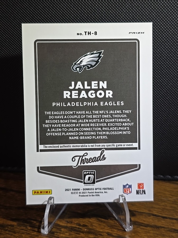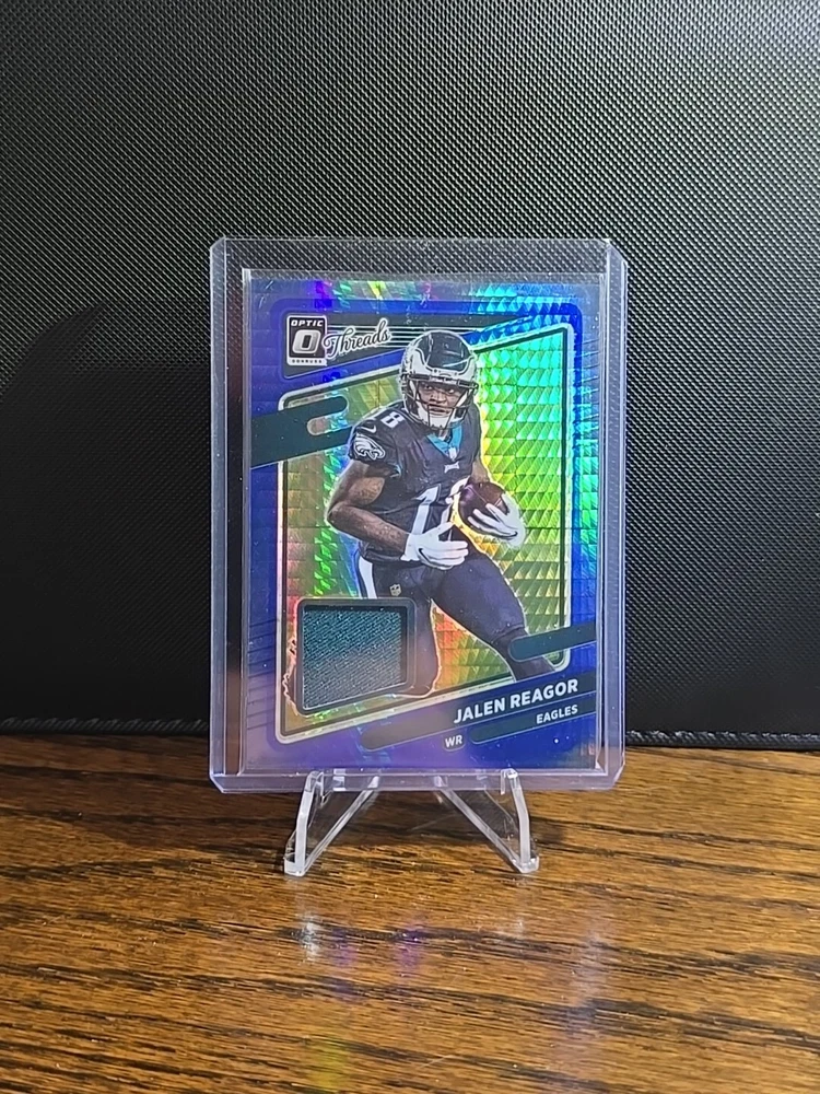 The 2021 Donruss Optic Threads Jalen Reagor Mem Patch Hyper Blue Eagles card features a memorabilia patch of Philadelphia Eagles player Jalen Reagor. This original sports trading card is part of the 2021 Panini Donruss Optic set and includes a patch variation, making it a unique addition for collectors of NFL trading cards. The card is in near mint or better condition and showcases Reagor as part of the National Football League (NFL) season.