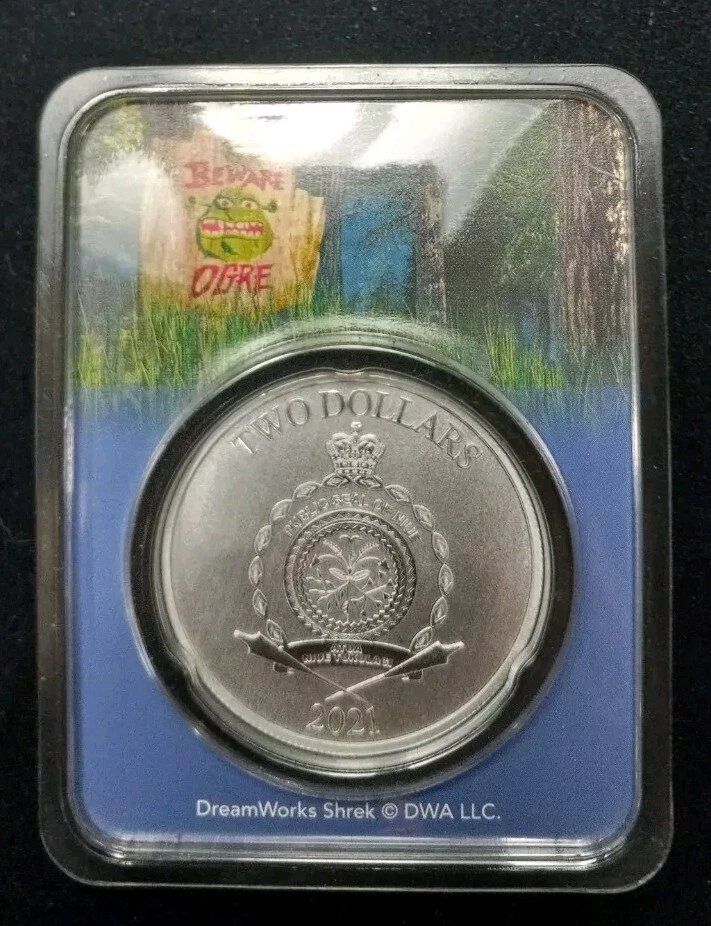 Strike Type: Proof-Like Brand/Mint: Niue Coin: Shrek Certification: Uncertified Grade: Ungraded Brand: Dreamworks Composition: Silver Year: 2021 Country/Region of Manufacture: Niue Precious Metal Content per Unit: 1 oz Fineness: 0.999