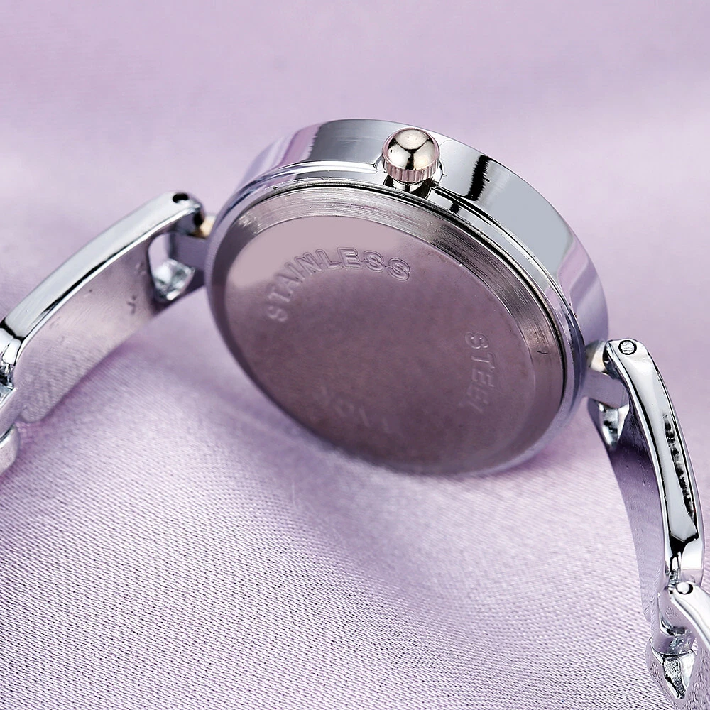Feature : Quantity: 1 Fashion women wrist watch Dial Window Material: Glass Case Material: Alloy Dial Material: Stainless Steel Movement: Quartz Case Shape: Round Style: Fashion & Casual Dial Display: Analog Band Material: Stainless Steel Size:case:2.5cm watch band size:18.5cm band width: 0.7cm Dial Thickness:0.7cm Waterproof: No Occasions for gifts: Advertising and promotion, business gifts, holiday, housewarming , birthday, travel Color:Gold,Sliver Package Content: 1PC Watch