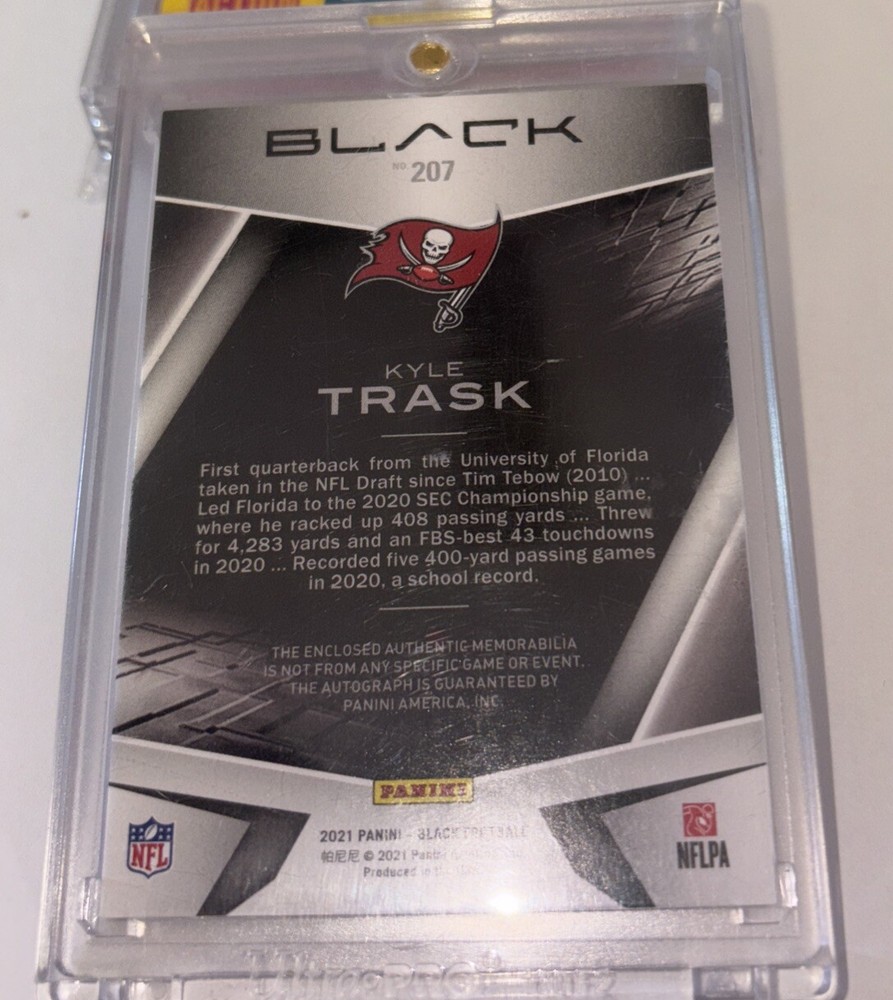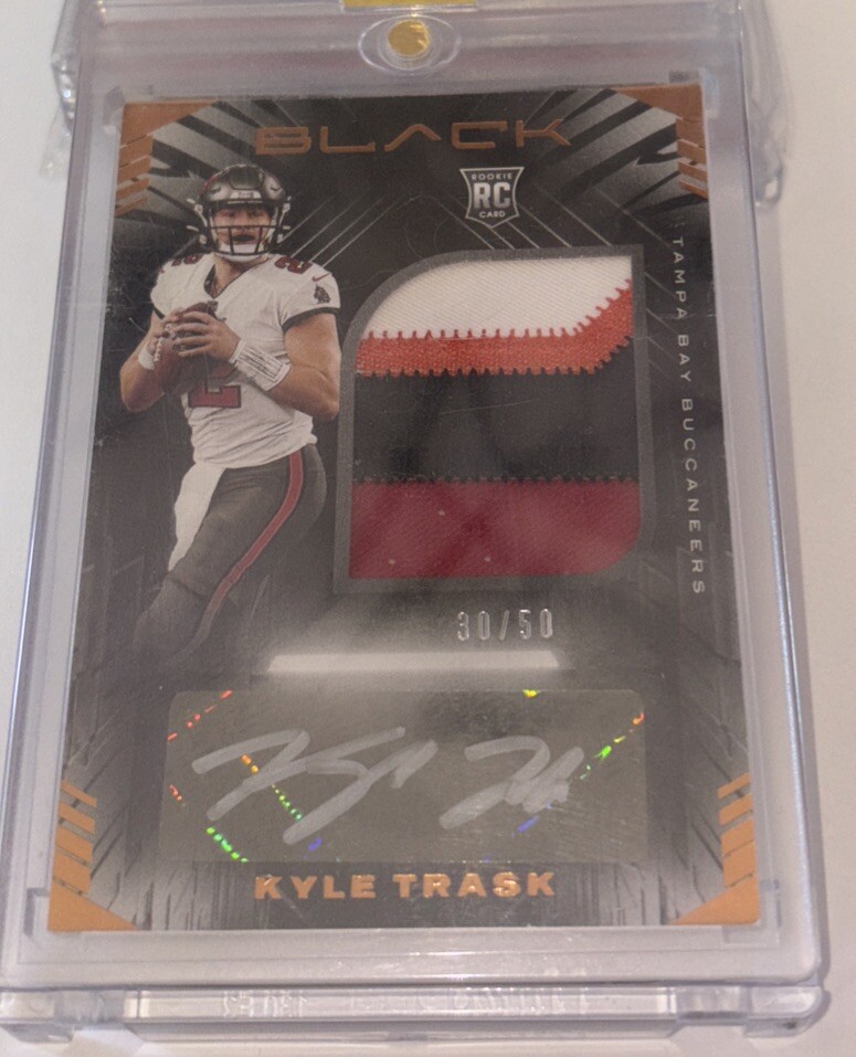 Elevate your collection with the 2021 Panini Black Rookie Four Color Patch Auto #207 featuring Kyle Trask, numbered 30/50. A standout addition for any Tampa Bay Buccaneers or NFL enthusiast, this card showcases the promising talent of quarterback Kyle Trask, captured during the 2021 season. With a vibrant four-color patch and an authentic autograph, this card truly stands out. Crafted from premium card stock and originating from the United States, this collectible is part of the esteemed 2021 Panini Black set, known for its exclusivity and quality. The card is a celebration of Trask's rookie year, making it a memorable piece for fans and collectors alike. It's a tangible piece of sports history that encapsulates the excitement of the Super Bowl and the promise of a rising star.