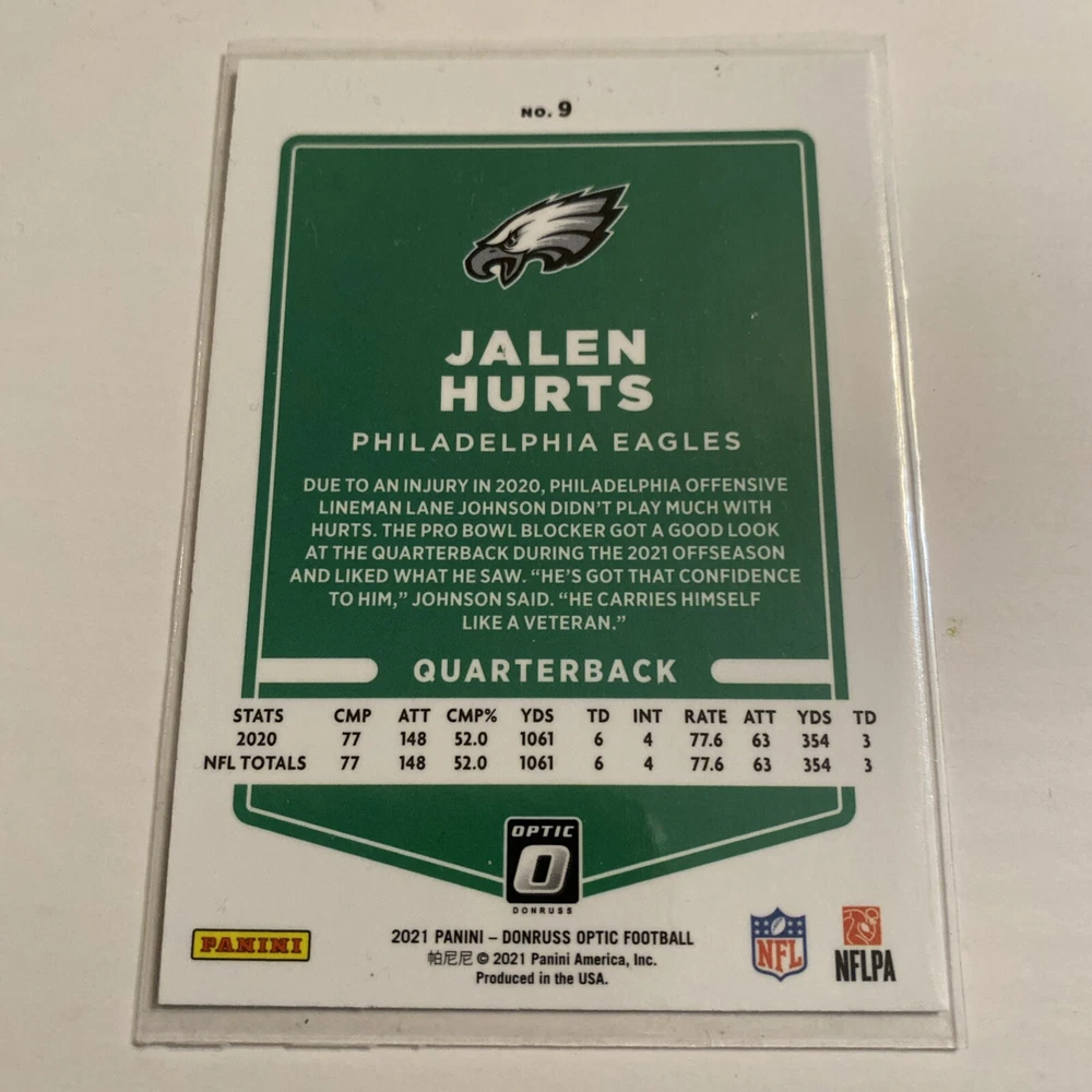 Elevate your sports card collection with the 2021 Panini Donruss Optic #9 featuring the dynamic Philadelphia Eagles quarterback, Jalen Hurts. This card captures the essence of the 2021 NFL season and is a must-have for fans and collectors alike. The Optic parallel variety adds a unique touch of flair to this already impressive piece. Crafted by renowned manufacturer Panini, this card is part of the highly sought-after base set and reflects the high standards of quality that the brand is known for. Whether you're a die-hard Eagles supporter or a collector of NFL memorabilia, this card is an excellent addition to any collection.