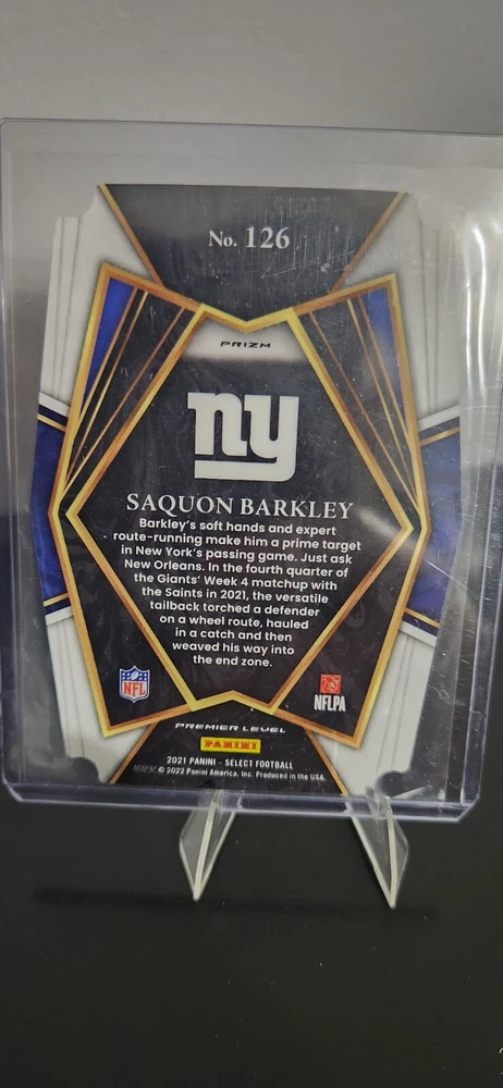 This 2021 Panini Select sports trading card features Saquon Barkley, a talented player from the National Football League (NFL). The card is from the Premier Level subset and has a red and blue prizm die-cut design. It is ungraded and manufactured by Panini. The card is a great addition to any collection and would make a perfect gift for a sports fan. It is part of the base set and has the card number 126. This card is not autographed and is near mint or better in condition details. Get your hands on this stunning card today and add it to your collection!