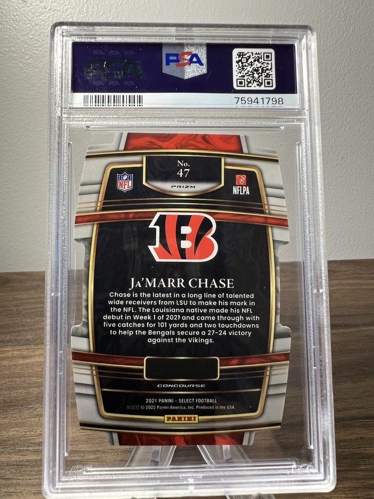 The 2021 Select Die Cut Black Gold Prizm Ja'Marr Chase rookie card features the Cincinnati Bengals wide receiver in his NFL rookie season. This original trading card is from the National Football League (NFL) and is part of the 2021 Select set. Graded as a PSA 10 Gem Mint, this card showcases a black gold prizm parallel variety, making it a highly sought-after collectible among football card enthusiasts. The card is in standard size and manufactured in the United States by Select.