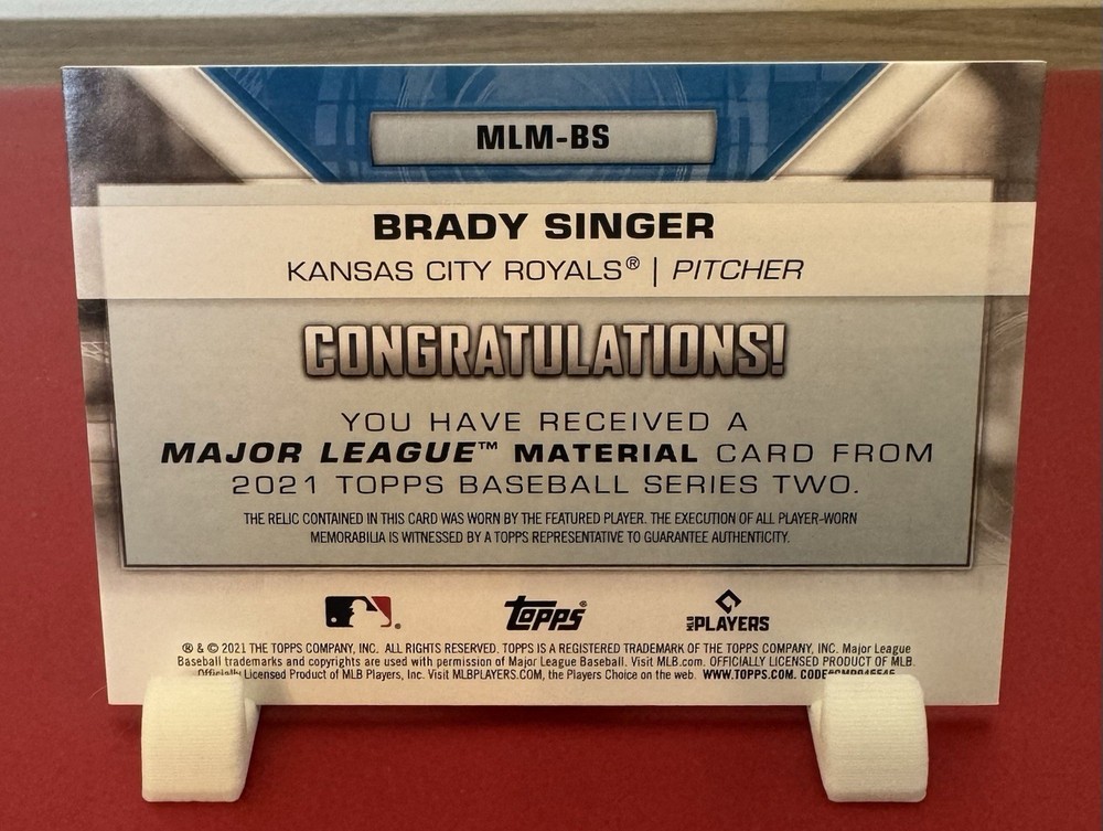 Elevate your baseball card collection with the 2021 Topps Major League Materials Series 2 card featuring promising talent, Brady Singer of the Kansas City Royals. This card, numbered MLM-BS and limited to a print run of just 199, captures the essence of the rookie season and includes memorabilia for collectors to cherish. Crafted from quality card stock, the card is a testament to Singer's burgeoning career in Major League Baseball. As an original release from the reputable Topps manufacturer, this non-autographed piece sits ungraded, ready to be the next gem in your personal anthology of sports history.