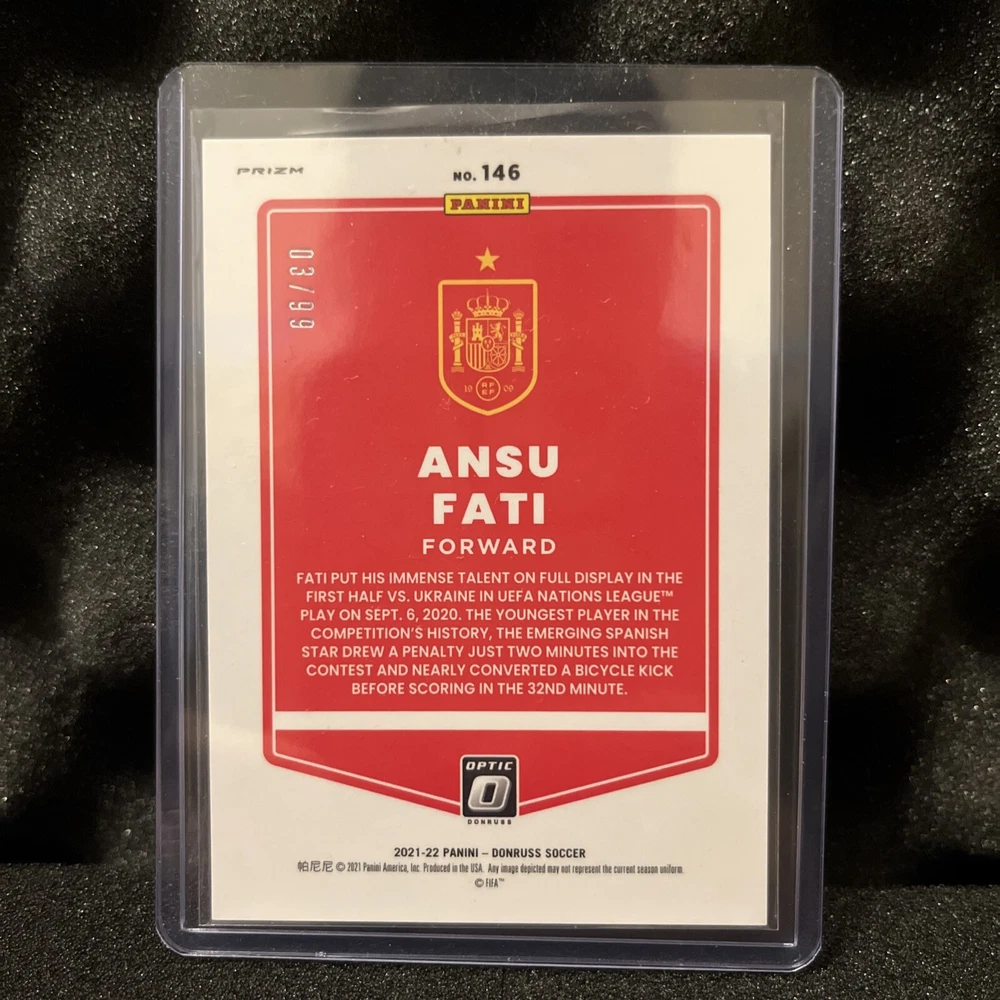 The 2021-2022 Donruss Soccer Optic Ansu Fati Purple Velocity /99 trading card features the player Ansu Fati from FC Barcelona and Spain. Manufactured by Donruss in 2022, this card is part of the Optic parallel/variety and set. It is serial numbered and an insert, showcasing a purple velocity design limited to only 99 copies. This near mint or better card is a sought-after collectible for soccer fans and card enthusiasts looking to add a unique piece to their collection.