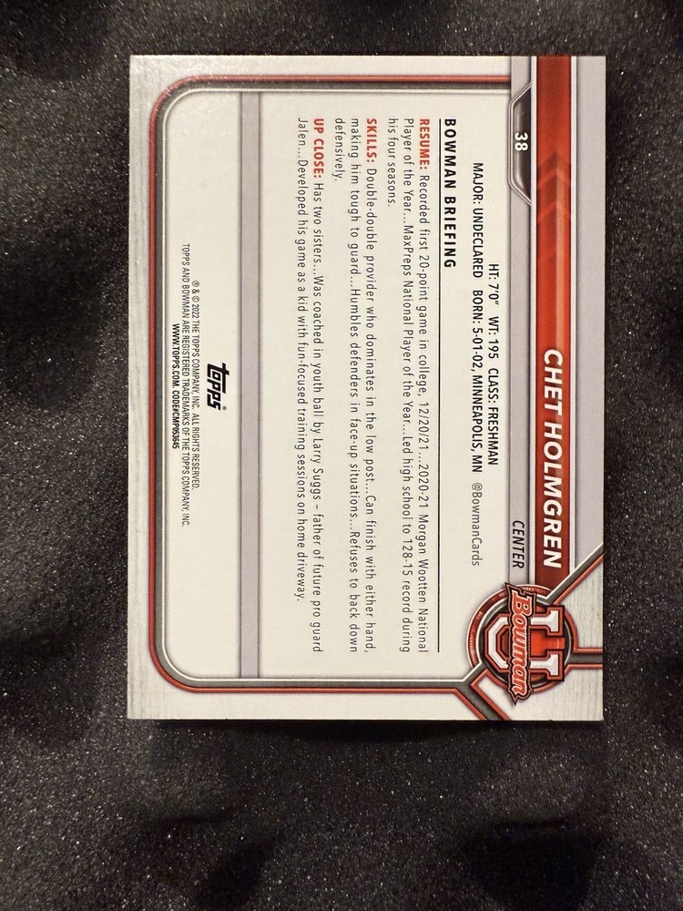 2021-22 Bowman University Basketball Chet Holmgren base paper 1st Bowman # 38