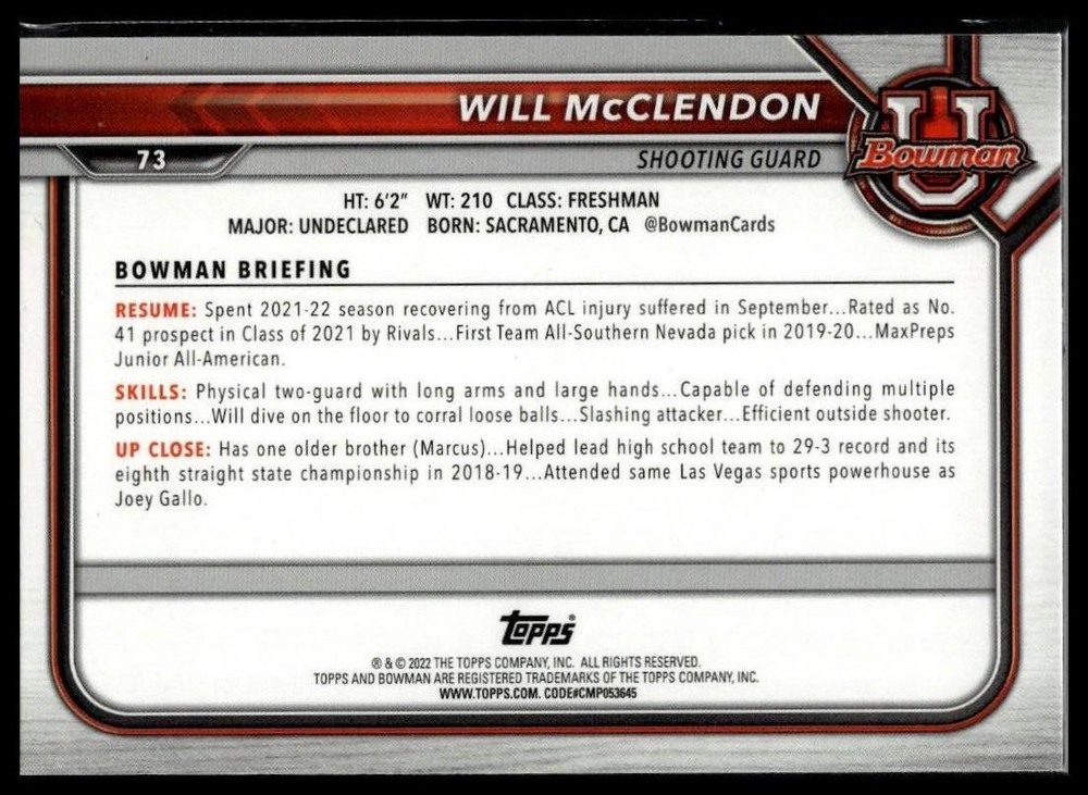 This is a nice example of a 2021-22 Bowman University #73 Will McClendon Other important information about this card: Bowman 1st Base,Rookie,RC,Chase,Checklist,Parallel In 2021 Will McClendon played for the UCLA Bruins. Please check out our other listings for more great cards.