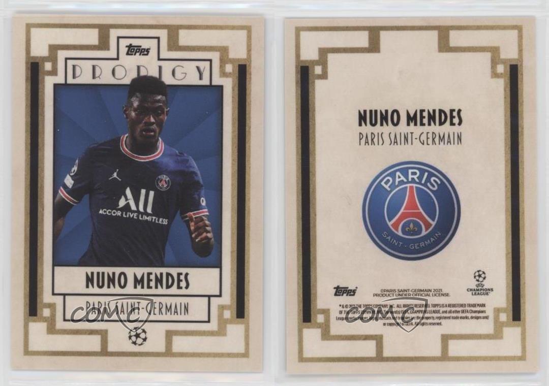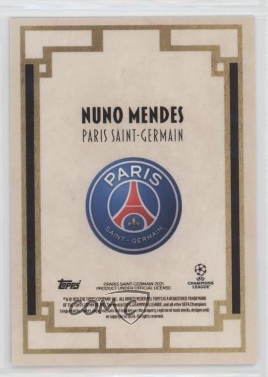 2021-22 Topps Deco UCL - Prodigy #_NUME Nuno Mendes - Rookie - Soccer Card - Featuring the Paris Saint-Germain - Featuring Nuno Mendes Search for more: 2021-22 Topps Deco UCL Search for more: 2021-22 Topps Deco UCL - Prodigy View all of our Listings Auctions Buy It Now About Us Located in the beautiful Pacific Northwest, COMC (Check Out My Cards) is the world's largest consignment service for trading card singles. More than 10,000 people have used our consignment service to list over 50 million trading cards. Find out how we can help you consign your items on eBay by contacting us through eBay messaging. COMC -- "The Safe & Easy Way to Buy & Sell" Representative Image - Select Specific Item above to see image of actual item Representative Image - Select Specific Item above to see image of actual item Raw Condition for Modern Cards Unless otherwise noted, raw modern cards are listed in Near Mint-Mint condition or better. A NM-MT card appears to be Mint at first glance, but upon closer inspection, may exhibit some of the following: minor print defects (e.g. roller marks, print line, dimple), minor scratches, slight edge wear, and slight corner wear. Centering is clearly visible in the images provided and does not factor into our condition assessment. Raw Condition for Vintage Cards Unless otherwise noted, raw vintage cards are listed in Excellent condition or better. An EX card may exhibit some of the following: minor rounding of corners, surface wear, print defects, light scratches, and slight edge wear/chipping. Centering is clearly visible in the images provided and does not factor into our condition assessment. Domestic Shipping Combined shipping for multiple items is available. To receive combined shipping, please ensure all desired items are in your eBay shopping cart before proceeding to checkout. eBay limits orders to 40 items per order. We automatically combine multiple orders placed on the same day. If you place multiple orders on the same day, please contact us to request a refund of applicable shipping costs. Signature confirmation may be required on invoices over $400. All cards are protected and shipped securely. International Shipping COMC offers eBay's International Shipping (EIS) for international orders under $2,500* (see country exceptions below). All duties and import fees are paid at checkout; in the rare event that there are additional import fees upon delivery, these are borne by the buyer. EIS packages route through a shipping hub in Erlanger, KY before shipping to their final destination. Please note that EIS does not allow for combined shipments. The shipping rates are determined by eBay and cannot be adjusted. *Maximum sale price exceptions: Colombia, Kuwait ($2,000); Taiwan ($1,539); Chile, Costa Rica, Guatemala, Honduras, Trinidad and Tobago ($1,000); Antigua and Barbuda, Aruba, Belize, Dominica, Grenada, Philippines, Saint Kitts and Nevis, Saint Lucia, Montserrat, Turks and Caicos Islands ($500); Dominican Republic, El Salvador ($200). Please request a shipping quote through eBay messaging for orders that exceed the maximum sale price supported by eBay's International Shipping. You will be responsible for all duties and import fees for international orders shipped outside the EIS. All cards are protected and shipped securely. Payment COMC does not accept offers on our cards through our eBay storefront. COMC utilizes eBay’s managed payments system. If you are experiencing difficulties making a payment, please contact eBay for assistance. Return Policy Returns are only accepted on the rare occasion the item is not as described. If you are making a return, please initiate the return process through eBay so a mailing label can be provided for you. Prior to listing, our expert team carefully assessed this item to represent it accurately. Please review the description and high-definition images prior to purchasing to ensure this item meets your satisfaction. We welcome you to contact us if you have further questions about this item. Trust and Integrity COMC carefully assesses each item consigned to us to prevent fraudulent items from entering the marketplace. If you believe an item offered on COMC may be fraudulent, please contact us with details so we can investigate the issue. Items we determine are outside our supported items policy may be removed. Last Modified: 11/20/2025 9:44:30 PM PDT