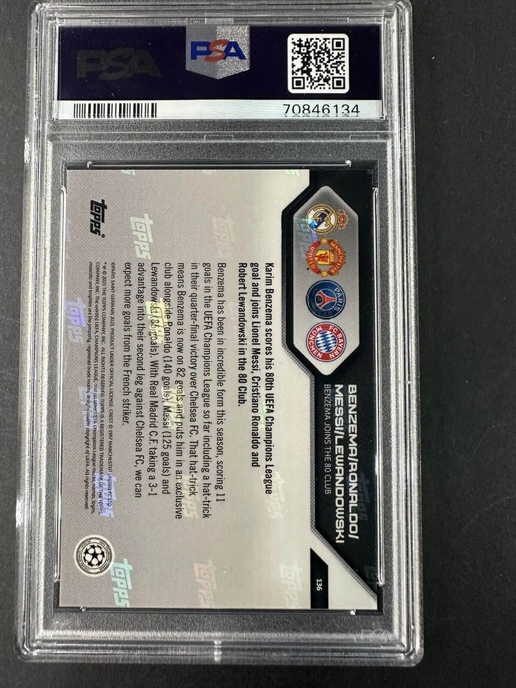 This 2021-22 Topps Now UCL #136 card features four of the greatest soccer players of our time: Benzema, Ronaldo, Messi, and Lewandowski. This sports trading card is graded by Professional Sports Authenticator (PSA) with a 9 grade, making it a highly sought-after collectible item for any fan of the UEFA Champions League. Manufactured by Topps, this card is part of the 2021 Topps Now set, capturing the excitement and drama of the current soccer season. Whether you're a fan of one of these legendary athletes or simply a collector of sports trading cards, this PSA 10 graded card is a must-have addition to your collection.