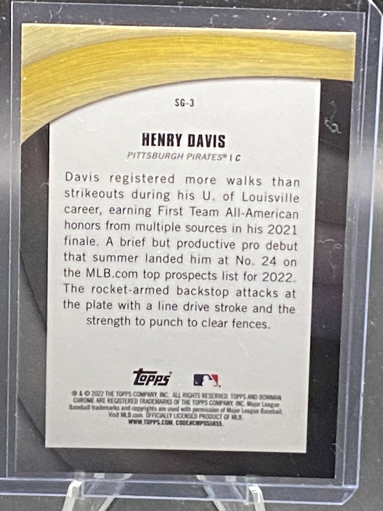 This is a nice example of a 2022 Bowman Chrome #SG-3 Henry Davis Shades of Greatness Other important information about this card: In 2022 Henry Davis played for the Pittsburgh Pirates. Please check out our other listings for more great cards.