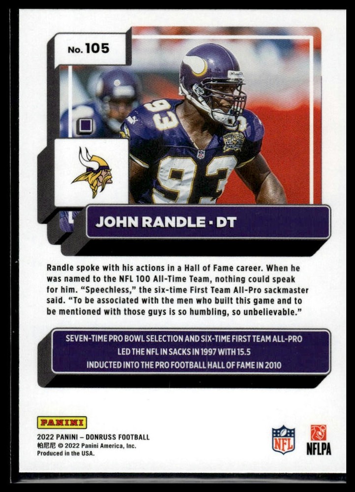 This is a nice example of a 2022 Donruss #105 John Randle Yellow Press Proof Other important information about this card: Chase,Checklist,Parallel,Insert,SP In 2022 John Randle played for the Minnesota Vikings. Please check out our other listings for more great cards.