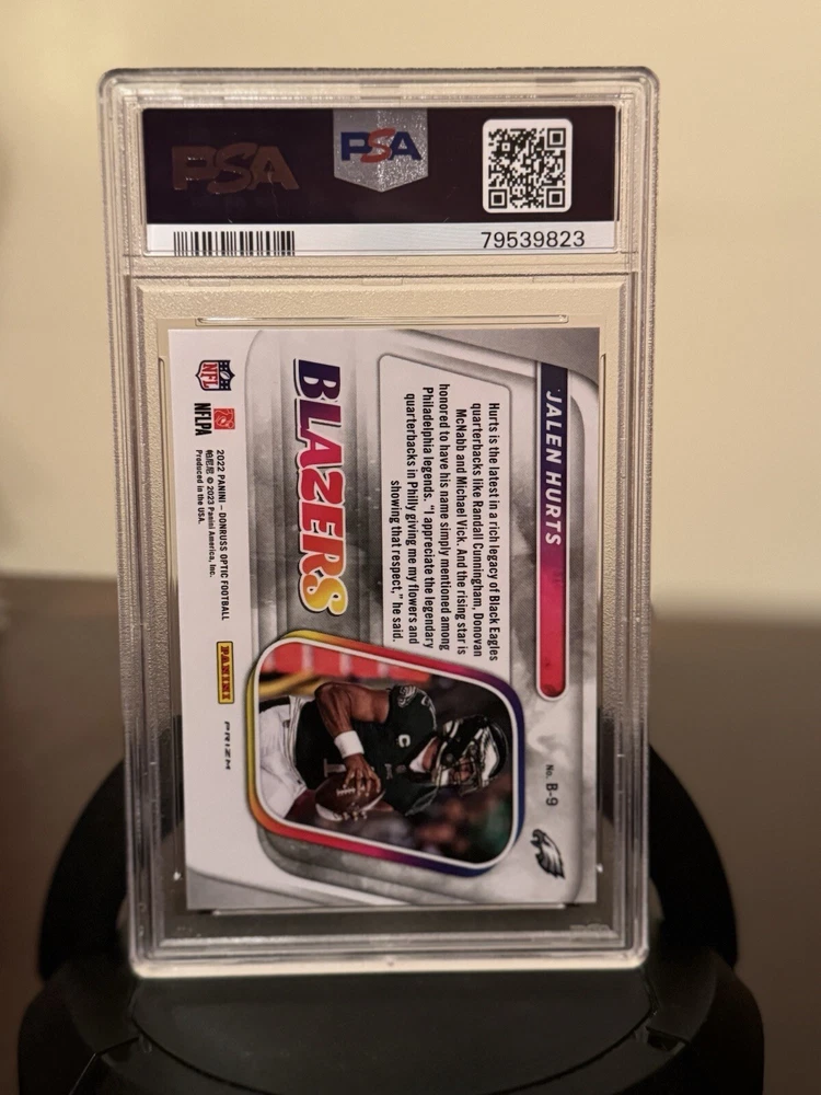 This 2022 Donruss Optic Jalen Hurts Blazers Case Hit PSA 10 Gem Mint trading card is a must-have for any football fan. Featuring a stunning image of the talented quarterback, this sports trading card is perfect for collectors looking to add to their collection. With its Optic parallel/variety and Donruss manufacturer, this card is sure to be a standout in any collection. The PSA 10 Gem Mint rating ensures the quality of the card is top-notch, making it a valuable addition to any sports trading card collection. Add this card to your collection today and show off your love for football!