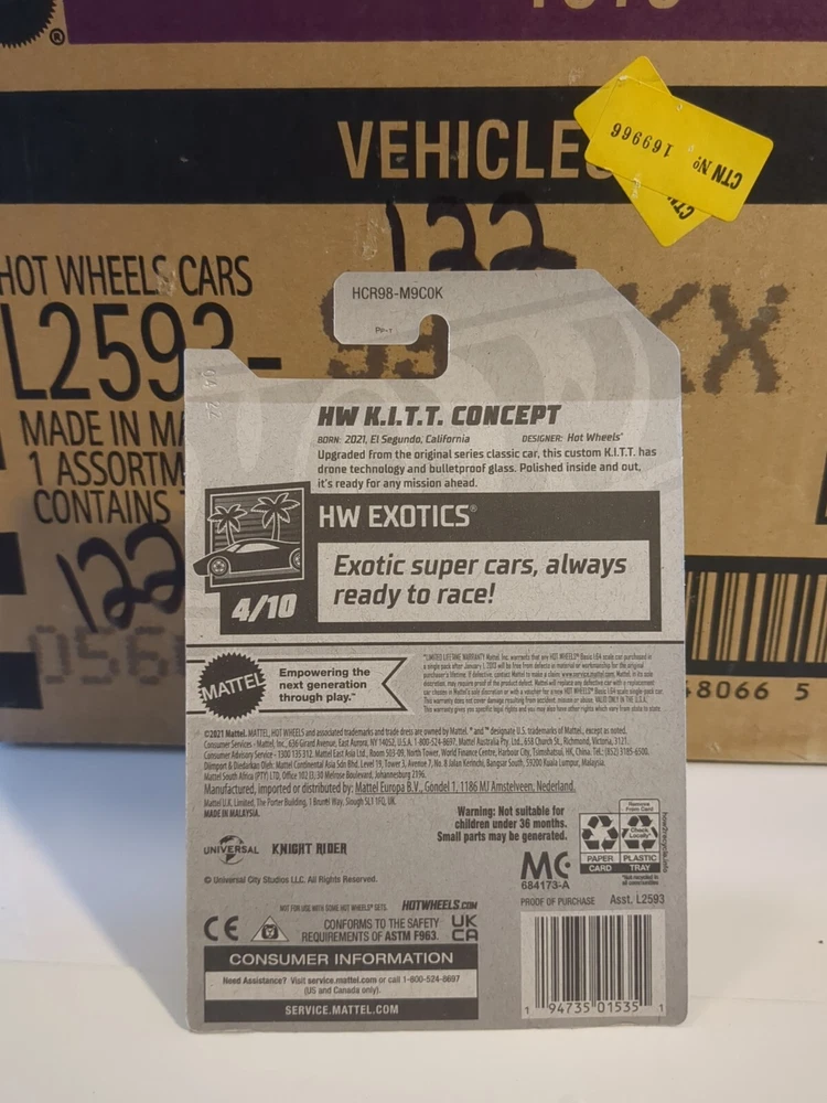 Introducing the 2022 Hot Wheels Knight Rider HW K.I.T.T. KITT Concept HW Exotics 185/250 NIP. This diecast car is a must-have for any Hot Wheels collector or fan of the Knight Rider series. The car is black in color and has a scale of 1:64. It is made from high-quality materials and is recommended for children aged 3 and above. The Hot Wheels Knight Rider HW K.I.T.T. KITT Concept HW Exotics 185/250 NIP is a stunning addition to any collection or toy box. With its intricate design and attention to detail, it is sure to impress. Whether you're a diehard Hot Wheels fan or a fan of the Knight Rider series, this car is a must-have. See pics for condition