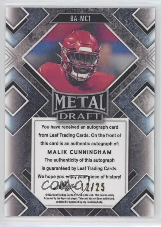 2022 Leaf Metal Draft - [Base] - Purple Prismatic #BA-MC1 Malik Cunningham Qty Made: 25 - Rookie - Football Card - Featuring Malik Cunningham Search for more: 2022 Leaf Metal Draft Search for more: 2022 Leaf Metal Draft - [Base] - Purple Prismatic View all of our Listings Auctions Buy It Now About Us Located in the beautiful Pacific Northwest, COMC (Check Out My Cards) is the world's largest consignment service for trading card singles. More than 10,000 people have used our consignment service to list over 50 million trading cards. Find out how we can help you consign your items on eBay by contacting us through eBay messaging. COMC -- "The Safe & Easy Way to Buy & Sell" Representative Image - Select Specific Item above to see image of actual item Representative Image - Select Specific Item above to see image of actual item Raw Condition for Modern Cards Unless otherwise noted, raw modern cards are listed in Near Mint-Mint condition or better. A NM-MT card appears to be Mint at first glance, but upon closer inspection, may exhibit some of the following: minor print defects (e.g. roller marks, print line, dimple), minor scratches, slight edge wear, and slight corner wear. Centering is clearly visible in the images provided and does not factor into our condition assessment. Raw Condition for Vintage Cards Unless otherwise noted, raw vintage cards are listed in Excellent condition or better. An EX card may exhibit some of the following: minor rounding of corners, surface wear, print defects, light scratches, and slight edge wear/chipping. Centering is clearly visible in the images provided and does not factor into our condition assessment. Domestic Shipping Combined shipping for multiple items is available. To receive combined shipping, please ensure all desired items are in your eBay shopping cart before proceeding to checkout. eBay limits orders to 40 items per order. We automatically combine multiple orders placed on the same day. If you place multiple orders on the same day, please contact us to request a refund of applicable shipping costs. Signature confirmation may be required on invoices over $400. All cards are protected and shipped securely. International Shipping COMC offers eBay's International Shipping (EIS) for international orders under $2,500* (see country exceptions below). All duties and import fees are paid at checkout; in the rare event that there are additional import fees upon delivery, these are borne by the buyer. EIS packages route through a shipping hub in Erlanger, KY before shipping to their final destination. Please note that EIS does not allow for combined shipments. The shipping rates are determined by eBay and cannot be adjusted. *Maximum sale price exceptions: Colombia, Kuwait ($2,000); Taiwan ($1,539); Chile, Costa Rica, Guatemala, Honduras, Trinidad and Tobago ($1,000); Antigua and Barbuda, Aruba, Belize, Dominica, Grenada, Philippines, Saint Kitts and Nevis, Saint Lucia, Montserrat, Turks and Caicos Islands ($500); Dominican Republic, El Salvador ($200). Please request a shipping quote through eBay messaging for orders that exceed the maximum sale price supported by eBay's International Shipping. You will be responsible for all duties and import fees for international orders shipped outside the EIS. All cards are protected and shipped securely. Payment COMC does not accept offers on our cards through our eBay storefront. COMC utilizes eBay’s managed payments system. If you are experiencing difficulties making a payment, please contact eBay for assistance. Return Policy Returns are only accepted on the rare occasion the item is not as described. If you are making a return, please initiate the return process through eBay so a mailing label can be provided for you. Prior to listing, our expert team carefully assessed this item to represent it accurately. Please review the description and high-definition images prior to purchasing to ensure this item meets your satisfaction. We welcome you to contact us if you have further questions about this item. Trust and Integrity COMC carefully assesses each item consigned to us to prevent fraudulent items from entering the marketplace. If you believe an item offered on COMC may be fraudulent, please contact us with details so we can investigate the issue. Items we determine are outside our supported items policy may be removed. Last Modified: 11/20/2025 9:33:11 PM PDT