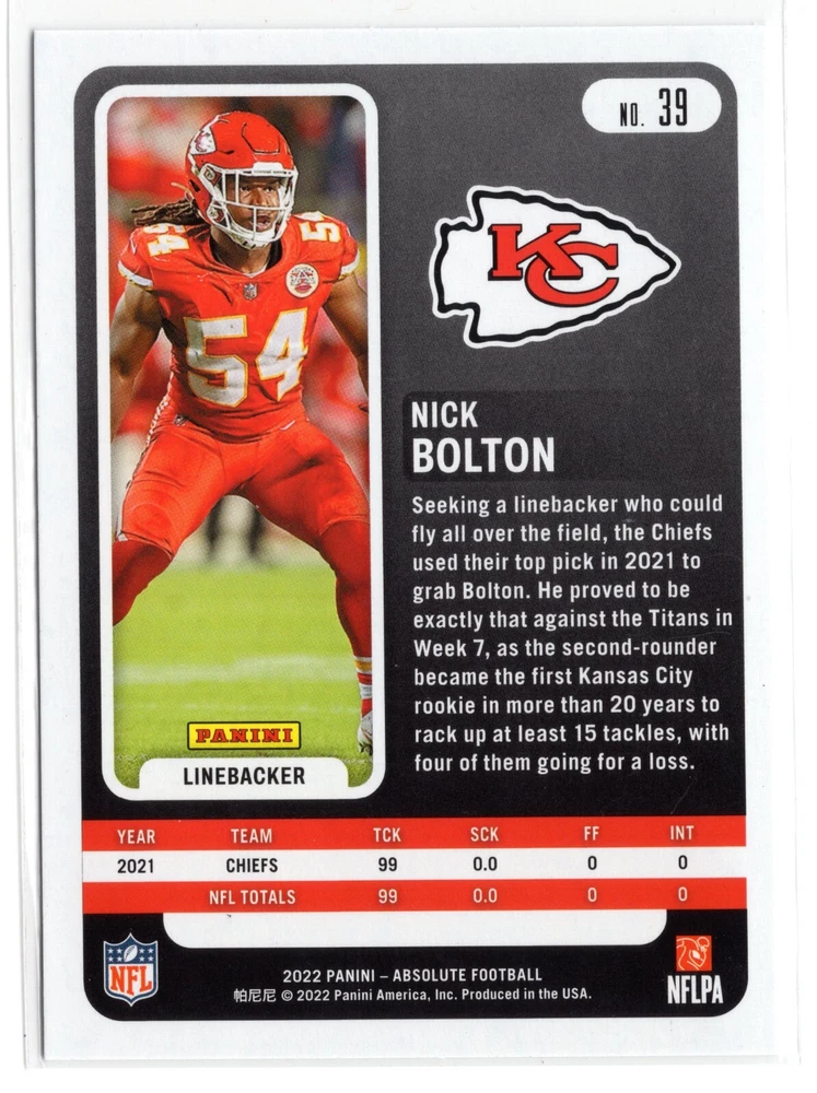 This 2022 Panini Absolute Football trading card features Nick Bolton, player for the Kansas City Chiefs. With a card size of standard and thickness of 35 Pt., this card is made of high-quality card stock material. It is a great addition to any collector's sports trading card set. The card is part of the 2022 Panini Absolute set and is perfect for fans of the National Football League (NFL) and the Super Bowl. This English language card is manufactured in the United States by Panini, a well-known name in the trading card industry. Don't miss your chance to own this rare and unique card.