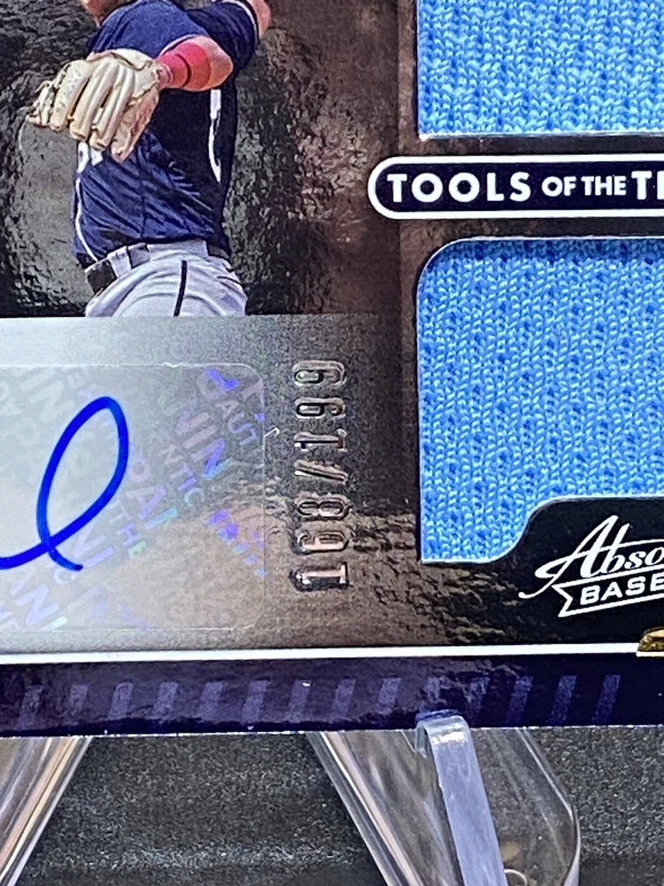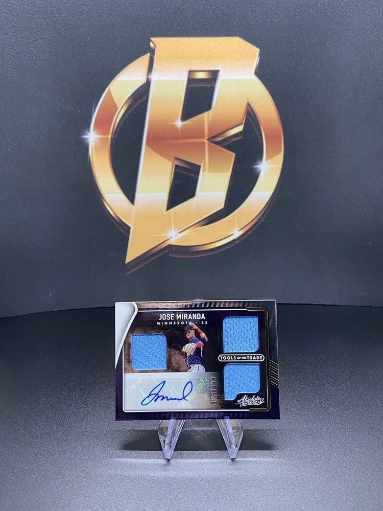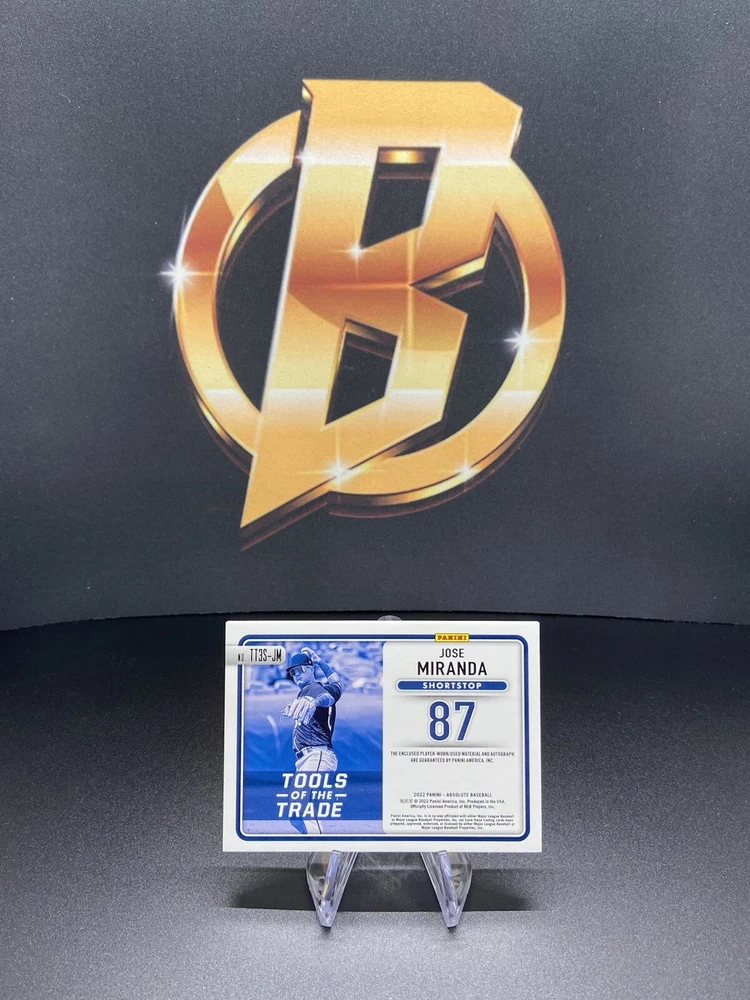 This is a rare and valuable trading card featuring baseball player Jose Miranda. The card is part of the 2022 Panini Absolute set and is a Tools of the Trade 3 Swatch Signatures insert. It has a print run of only 199 and is serial numbered for added collectibility. The card is in near mint or better condition and is ungraded. It is perfect for any fan or collector of baseball trading cards, especially those who are looking for a rare and unique piece to add to their collection. The card features a rookie signature and memorabilia from the player, making it a highly sought-after item. This sports trading card has all the features that a collector would want, including a parallel variety and is a must-have for any serious collector.