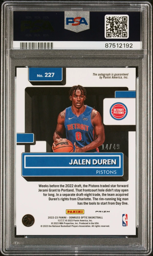 You are purchasing a 2022 Panini Donruss Optic Jalen Duren #227 Signature Blue /49 PSA 9. You will receive the exact item in the photographs. Thank you for looking. Listed With Mascot .