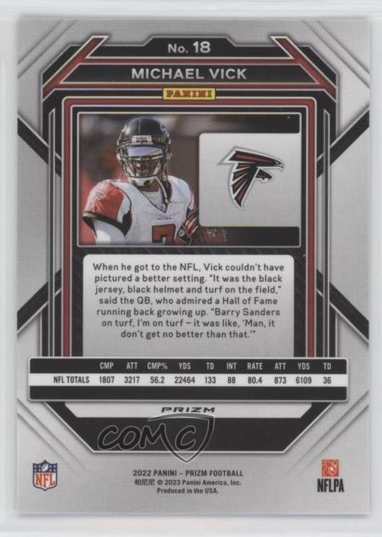 2022 Panini Prizm - [Base] - Green Prizm #18 Michael Vick - Football Card - Featuring the Atlanta Falcons - Featuring Michael Vick Search for more: 2022 Panini Prizm Search for more: 2022 Panini Prizm - [Base] - Green Prizm View all of our Listings Auctions Buy It Now About Us Located in the beautiful Pacific Northwest, COMC (Check Out My Cards) is the world's largest consignment service for trading card singles. More than 10,000 people have used our consignment service to list over 50 million trading cards. Find out how we can help you consign your items on eBay by contacting us through eBay messaging. COMC -- "The Safe & Easy Way to Buy & Sell" Representative Image - Select Specific Item above to see image of actual item Representative Image - Select Specific Item above to see image of actual item Raw Condition for Modern Cards Unless otherwise noted, raw modern cards are listed in Near Mint-Mint condition or better. A NM-MT card appears to be Mint at first glance, but upon closer inspection, may exhibit some of the following: minor print defects (e.g. roller marks, print line, dimple), minor scratches, slight edge wear, and slight corner wear. Centering is clearly visible in the images provided and does not factor into our condition assessment. Raw Condition for Vintage Cards Unless otherwise noted, raw vintage cards are listed in Excellent condition or better. An EX card may exhibit some of the following: minor rounding of corners, surface wear, print defects, light scratches, and slight edge wear/chipping. Centering is clearly visible in the images provided and does not factor into our condition assessment. Domestic Shipping Combined shipping for multiple items is available. To receive combined shipping, please ensure all desired items are in your eBay shopping cart before proceeding to checkout. eBay limits orders to 40 items per order. We automatically combine multiple orders placed on the same day. If you place multiple orders on the same day, please contact us to request a refund of applicable shipping costs. Signature confirmation may be required on invoices over $400. All cards are protected and shipped securely. International Shipping COMC offers eBay's International Shipping (EIS) for international orders under $2,500* (see country exceptions below). All duties and import fees are paid at checkout; in the rare event that there are additional import fees upon delivery, these are borne by the buyer. EIS packages route through a shipping hub in Erlanger, KY before shipping to their final destination. Please note that EIS does not allow for combined shipments. The shipping rates are determined by eBay and cannot be adjusted. *Maximum sale price exceptions: Colombia, Kuwait ($2,000); Taiwan ($1,539); Chile, Costa Rica, Guatemala, Honduras, Trinidad and Tobago ($1,000); Antigua and Barbuda, Aruba, Belize, Dominica, Grenada, Philippines, Saint Kitts and Nevis, Saint Lucia, Montserrat, Turks and Caicos Islands ($500); Dominican Republic, El Salvador ($200). Please request a shipping quote through eBay messaging for orders that exceed the maximum sale price supported by eBay's International Shipping. You will be responsible for all duties and import fees for international orders shipped outside the EIS. All cards are protected and shipped securely. Payment COMC does not accept offers on our cards through our eBay storefront. COMC utilizes eBay’s managed payments system. If you are experiencing difficulties making a payment, please contact eBay for assistance. Return Policy Returns are only accepted on the rare occasion the item is not as described. If you are making a return, please initiate the return process through eBay so a mailing label can be provided for you. Prior to listing, our expert team carefully assessed this item to represent it accurately. Please review the description and high-definition images prior to purchasing to ensure this item meets your satisfaction. We welcome you to contact us if you have further questions about this item. Trust and Integrity COMC carefully assesses each item consigned to us to prevent fraudulent items from entering the marketplace. If you believe an item offered on COMC may be fraudulent, please contact us with details so we can investigate the issue. Items we determine are outside our supported items policy may be removed. Last Modified: 11/21/2025 7:35:08 AM PDT