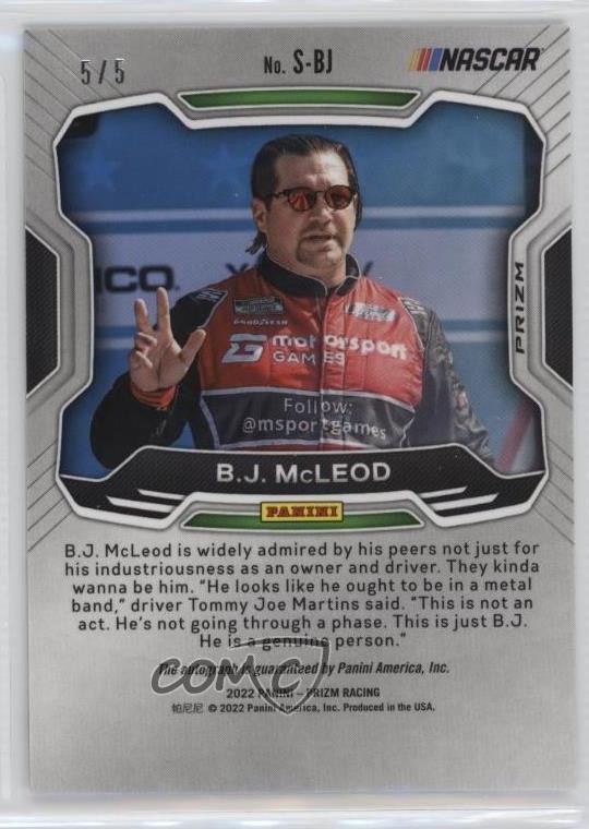 2022 Panini Prizm - Sensational Signatures - White Prizm #S-BJ B.J. McLeod Qty Made: 5 - Rookie - Racing Card - Featuring the Batteries Plus Bulbs , Ford and B.J. McLeod Motorsports - Featuring B.J. McLeod Search for more: 2022 Panini Prizm Search for more: 2022 Panini Prizm - Sensational Signatures - White Prizm View all of our Listings Auctions Buy It Now About Us Located in the beautiful Pacific Northwest, COMC (Check Out My Cards) is the world's largest consignment service for trading card singles. More than 10,000 people have used our consignment service to list over 50 million trading cards. Find out how we can help you consign your items on eBay by contacting us through eBay messaging. COMC -- "The Safe & Easy Way to Buy & Sell" Representative Image - Select Specific Item above to see image of actual item Representative Image - Select Specific Item above to see image of actual item Raw Condition for Modern Cards Unless otherwise noted, raw modern cards are listed in Near Mint-Mint condition or better. A NM-MT card appears to be Mint at first glance, but upon closer inspection, may exhibit some of the following: minor print defects (e.g. roller marks, print line, dimple), minor scratches, slight edge wear, and slight corner wear. Centering is clearly visible in the images provided and does not factor into our condition assessment. Raw Condition for Vintage Cards Unless otherwise noted, raw vintage cards are listed in Excellent condition or better. An EX card may exhibit some of the following: minor rounding of corners, surface wear, print defects, light scratches, and slight edge wear/chipping. Centering is clearly visible in the images provided and does not factor into our condition assessment. Domestic Shipping Combined shipping for multiple items is available. To receive combined shipping, please ensure all desired items are in your eBay shopping cart before proceeding to checkout. eBay limits orders to 40 items per order. We automatically combine multiple orders placed on the same day. If you place multiple orders on the same day, please contact us to request a refund of applicable shipping costs. Signature confirmation may be required on invoices over $400. All cards are protected and shipped securely. International Shipping COMC offers eBay's International Shipping (EIS) for international orders under $2,500* (see country exceptions below). All duties and import fees are paid at checkout; in the rare event that there are additional import fees upon delivery, these are borne by the buyer. EIS packages route through a shipping hub in Erlanger, KY before shipping to their final destination. Please note that EIS does not allow for combined shipments. The shipping rates are determined by eBay and cannot be adjusted. *Maximum sale price exceptions: Colombia, Kuwait ($2,000); Taiwan ($1,539); Chile, Costa Rica, Guatemala, Honduras, Trinidad and Tobago ($1,000); Antigua and Barbuda, Aruba, Belize, Dominica, Grenada, Philippines, Saint Kitts and Nevis, Saint Lucia, Montserrat, Turks and Caicos Islands ($500); Dominican Republic, El Salvador ($200). Please request a shipping quote through eBay messaging for orders that exceed the maximum sale price supported by eBay's International Shipping. You will be responsible for all duties and import fees for international orders shipped outside the EIS. All cards are protected and shipped securely. Payment COMC does not accept offers on our cards through our eBay storefront. COMC utilizes eBay’s managed payments system. If you are experiencing difficulties making a payment, please contact eBay for assistance. Return Policy Returns are only accepted on the rare occasion the item is not as described. If you are making a return, please initiate the return process through eBay so a mailing label can be provided for you. Prior to listing, our expert team carefully assessed this item to represent it accurately. Please review the description and high-definition images prior to purchasing to ensure this item meets your satisfaction. We welcome you to contact us if you have further questions about this item. Trust and Integrity COMC carefully assesses each item consigned to us to prevent fraudulent items from entering the marketplace. If you believe an item offered on COMC may be fraudulent, please contact us with details so we can investigate the issue. Items we determine are outside our supported items policy may be removed. Last Modified: 11/20/2025 11:54:28 PM PDT