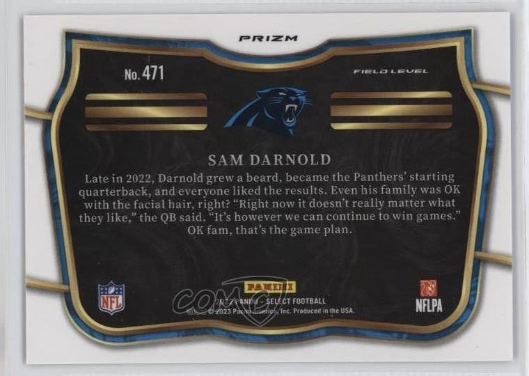 2022 Panini Select - [Base] - Cosmic Prizm #471 Field Level - Sam Darnold - Football Card - Featuring the Carolina Panthers - Featuring Sam Darnold Search for more: 2022 Panini Select Search for more: 2022 Panini Select - [Base] - Cosmic Prizm View all of our Listings Auctions Buy It Now About Us Located in the beautiful Pacific Northwest, COMC (Check Out My Cards) is the world's largest consignment service for trading card singles. More than 10,000 people have used our consignment service to list over 50 million trading cards. Find out how we can help you consign your items on eBay by contacting us through eBay messaging. COMC -- "The Safe & Easy Way to Buy & Sell" Representative Image - Select Specific Item above to see image of actual item Representative Image - Select Specific Item above to see image of actual item Raw Condition for Modern Cards Unless otherwise noted, raw modern cards are listed in Near Mint-Mint condition or better. A NM-MT card appears to be Mint at first glance, but upon closer inspection, may exhibit some of the following: minor print defects (e.g. roller marks, print line, dimple), minor scratches, slight edge wear, and slight corner wear. Centering is clearly visible in the images provided and does not factor into our condition assessment. Raw Condition for Vintage Cards Unless otherwise noted, raw vintage cards are listed in Excellent condition or better. An EX card may exhibit some of the following: minor rounding of corners, surface wear, print defects, light scratches, and slight edge wear/chipping. Centering is clearly visible in the images provided and does not factor into our condition assessment. Domestic Shipping Combined shipping for multiple items is available. To receive combined shipping, please ensure all desired items are in your eBay shopping cart before proceeding to checkout. eBay limits orders to 40 items per order. We automatically combine multiple orders placed on the same day. If you place multiple orders on the same day, please contact us to request a refund of applicable shipping costs. Signature confirmation may be required on invoices over $400. All cards are protected and shipped securely. International Shipping COMC offers eBay's International Shipping (EIS) for international orders under $2,500* (see country exceptions below). All duties and import fees are paid at checkout; in the rare event that there are additional import fees upon delivery, these are borne by the buyer. EIS packages route through a shipping hub in Erlanger, KY before shipping to their final destination. Please note that EIS does not allow for combined shipments. The shipping rates are determined by eBay and cannot be adjusted. *Maximum sale price exceptions: Colombia, Kuwait ($2,000); Taiwan ($1,539); Chile, Costa Rica, Guatemala, Honduras, Trinidad and Tobago ($1,000); Antigua and Barbuda, Aruba, Belize, Dominica, Grenada, Philippines, Saint Kitts and Nevis, Saint Lucia, Montserrat, Turks and Caicos Islands ($500); Dominican Republic, El Salvador ($200). Please request a shipping quote through eBay messaging for orders that exceed the maximum sale price supported by eBay's International Shipping. You will be responsible for all duties and import fees for international orders shipped outside the EIS. All cards are protected and shipped securely. Payment COMC does not accept offers on our cards through our eBay storefront. COMC utilizes eBay’s managed payments system. If you are experiencing difficulties making a payment, please contact eBay for assistance. Return Policy Returns are only accepted on the rare occasion the item is not as described. If you are making a return, please initiate the return process through eBay so a mailing label can be provided for you. Prior to listing, our expert team carefully assessed this item to represent it accurately. Please review the description and high-definition images prior to purchasing to ensure this item meets your satisfaction. We welcome you to contact us if you have further questions about this item. Trust and Integrity COMC carefully assesses each item consigned to us to prevent fraudulent items from entering the marketplace. If you believe an item offered on COMC may be fraudulent, please contact us with details so we can investigate the issue. Items we determine are outside our supported items policy may be removed. Last Modified: 11/21/2025 12:55:43 AM PDT