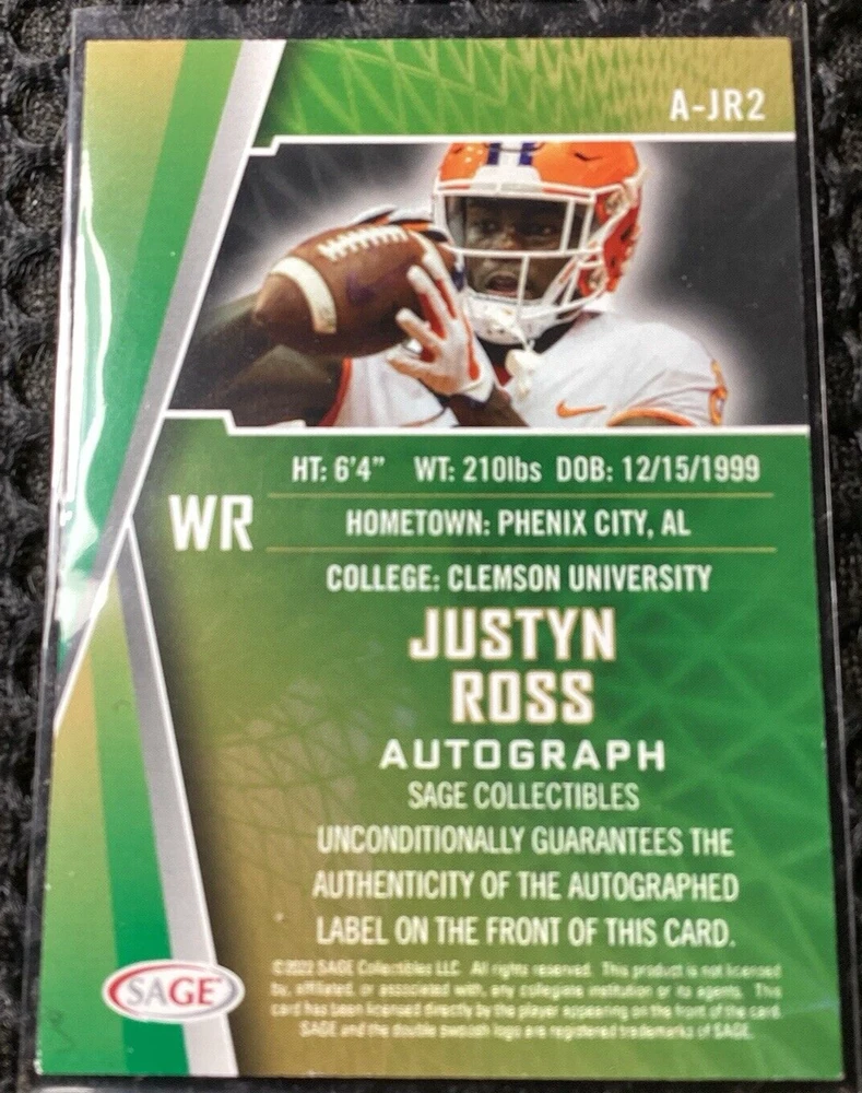 The 2022 SAGE High Series trading card features a black parallel autograph of football player Justyn Ross from the Clemson Tigers. This sports trading card is a rookie insert with the card number A-JR2, part of the 2022 collection by SAGE in collaboration with the National Collegiate Athletic Association (NCAA). The card is a valuable addition for fans and collectors of college football memorabilia.