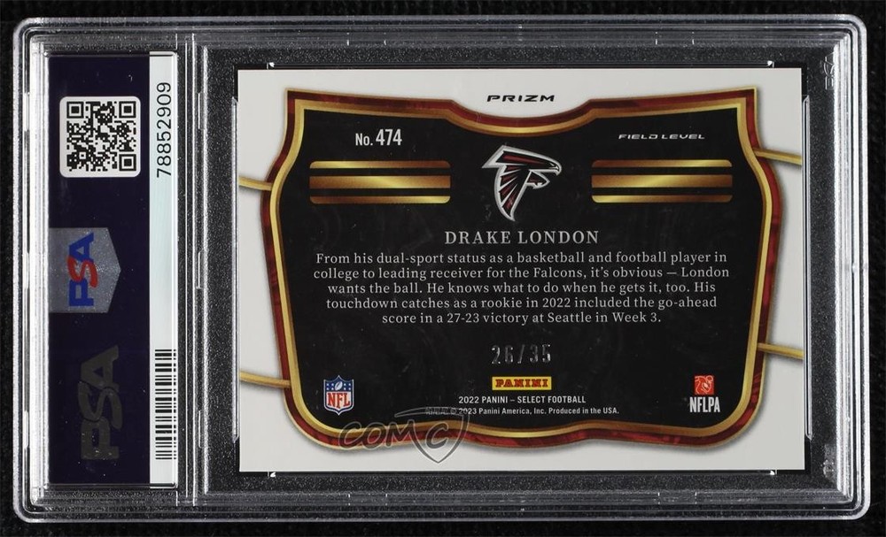 2022 Panini Select - [Base] - White Prizm #474 Field Level - Drake London Qty Made: 35 Graded PSA 10 GEM MT - RC (Rookie Card) - Football Card - Featuring the Atlanta Falcons - Featuring Drake London Search for more: 2022 Panini Select Search for more: 2022 Panini Select - [Base] - White Prizm View all of our Listings Auctions Buy It Now About Us Located in the beautiful Pacific Northwest, COMC (Check Out My Cards) is the world's largest consignment service for trading card singles. More than 10,000 people have used our consignment service to list over 50 million trading cards. Find out how we can help you consign your items on eBay by contacting us through eBay messaging. COMC -- "The Safe & Easy Way to Buy & Sell" Representative Image - Select Specific Item above to see image of actual item Representative Image - Select Specific Item above to see image of actual item Raw Condition for Modern Cards Unless otherwise noted, raw modern cards are listed in Near Mint-Mint condition or better. A NM-MT card appears to be Mint at first glance, but upon closer inspection, may exhibit some of the following: minor print defects (e.g. roller marks, print line, dimple), minor scratches, slight edge wear, and slight corner wear. Centering is clearly visible in the images provided and does not factor into our condition assessment. Raw Condition for Vintage Cards Unless otherwise noted, raw vintage cards are listed in Excellent condition or better. An EX card may exhibit some of the following: minor rounding of corners, surface wear, print defects, light scratches, and slight edge wear/chipping. Centering is clearly visible in the images provided and does not factor into our condition assessment. Domestic Shipping Combined shipping for multiple items is available. To receive combined shipping, please ensure all desired items are in your eBay shopping cart before proceeding to checkout. eBay limits orders to 40 items per order. We automatically combine multiple orders placed on the same day. If you place multiple orders on the same day, please contact us to request a refund of applicable shipping costs. Signature confirmation may be required on invoices over $400. All cards are protected and shipped securely. International Shipping COMC offers eBay's International Shipping (EIS) for international orders under $2,500* (see country exceptions below). All duties and import fees are paid at checkout; in the rare event that there are additional import fees upon delivery, these are borne by the buyer. EIS packages route through a shipping hub in Erlanger, KY before shipping to their final destination. Please note that EIS does not allow for combined shipments. The shipping rates are determined by eBay and cannot be adjusted. *Maximum sale price exceptions: Colombia, Kuwait ($2,000); Taiwan ($1,539); Chile, Costa Rica, Guatemala, Honduras, Trinidad and Tobago ($1,000); Antigua and Barbuda, Aruba, Belize, Dominica, Grenada, Philippines, Saint Kitts and Nevis, Saint Lucia, Montserrat, Turks and Caicos Islands ($500); Dominican Republic, El Salvador ($200). Please request a shipping quote through eBay messaging for orders that exceed the maximum sale price supported by eBay's International Shipping. You will be responsible for all duties and import fees for international orders shipped outside the EIS. All cards are protected and shipped securely. Payment COMC does not accept offers on our cards through our eBay storefront. COMC utilizes eBay’s managed payments system. If you are experiencing difficulties making a payment, please contact eBay for assistance. Return Policy Returns are only accepted on the rare occasion the item is not as described. If you are making a return, please initiate the return process through eBay so a mailing label can be provided for you. Prior to listing, our expert team carefully assessed this item to represent it accurately. Please review the description and high-definition images prior to purchasing to ensure this item meets your satisfaction. We welcome you to contact us if you have further questions about this item. Trust and Integrity COMC carefully assesses each item consigned to us to prevent fraudulent items from entering the marketplace. If you believe an item offered on COMC may be fraudulent, please contact us with details so we can investigate the issue. Items we determine are outside our supported items policy may be removed. Last Modified: 11/21/2025 3:20:46 AM PDT